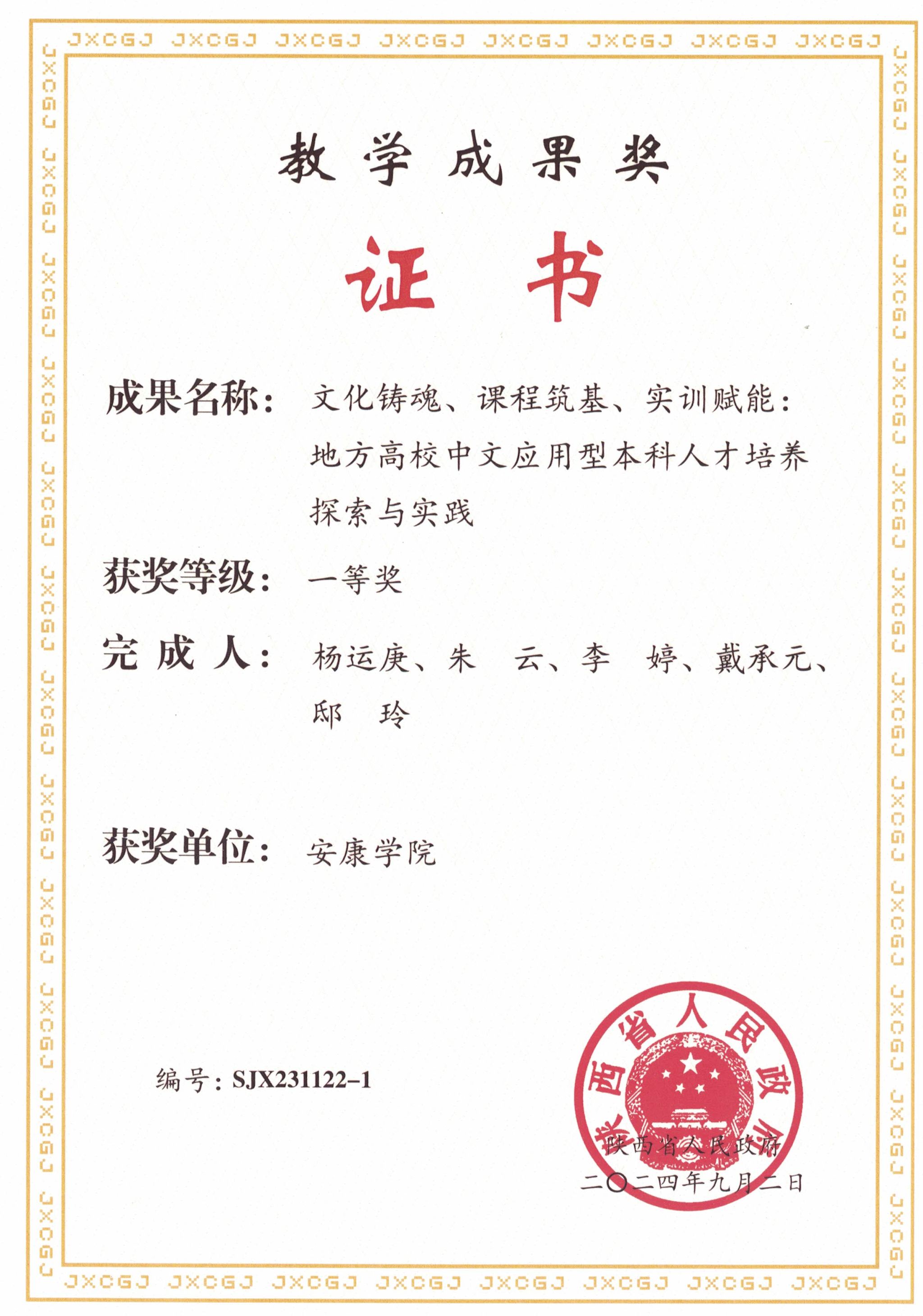 近日,陕西省人民政府发布了《陕西省人民政府办公厅关于表彰2023年高等教育教学成果奖获奖项目的通报》,koko体育官网杨运庚教授领衔申报的“文化铸魂、课程筑基、实训赋能:地方高校中文应用型本科人才培养探索与实践”荣获陕西省高等教育教学成果一等奖,获奖等次取得了新的重大突破,彰显了koko官网在中文应用型本科人才培养改革探索上取得的实效。
