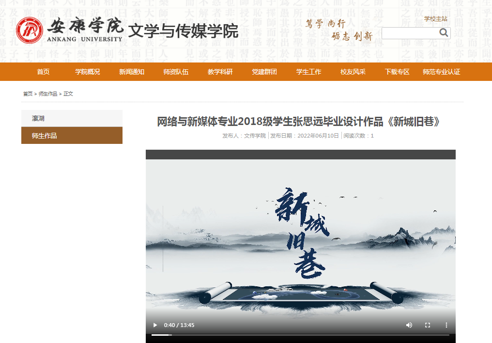 探索以视频设计创作替代传统毕业论文写作的新型模式。继2021毕业生创作出《非遗中的五里稠酒》《舌尖上的炕炕馍》毕业设计作品后,2022年学院进一步规范视频设计创作类毕业论文指导,细化毕业设计流程,毕业生创作并拍摄了《见城见茶》《指尖非遗》《偷窥》《新城旧巷》等4组视频作为毕业设计作品,圆满完成毕业设计任务,达到毕业要求并分别获得了优秀、良好等次。