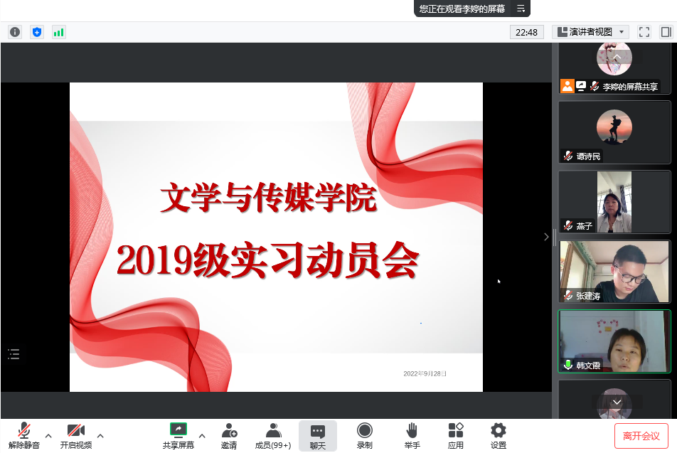 为进一步做好2019级实习工作,9月28日下午,koko体育官网通过腾讯会议平台召开2019级实习动员会。学院教学副院长李婷、汉语言文学系主任韩文霞、秘书与新媒体系主任谭诗民、秘书与新媒体系副主任张建涛、学院教学秘书张燕以及2019级全体学生参加会议。