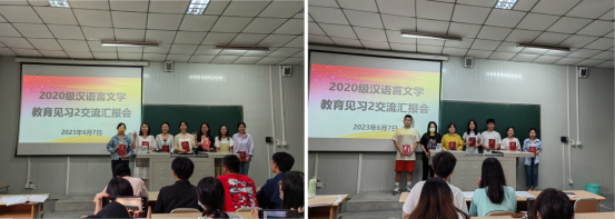 针对前期的教育见习活动,2023年6月7日,唐明珍组织全体学生在江南校区1014教室开展了教育见习2的交流汇报活动。此次活动以小组为单位,十四个汇报小组围绕文言文教学、高效课堂的思考、初高中语文教学的对比、班级管理策略、班会活动的开展等主题,结合各种课例与课程标准理念交流分享小组此次见习的心得,并选出代表进行汇报。每组汇报结束后,唐明珍进行指导点评,指出每组的优点与不足。在交流大会上,同学们积极分享自己在此次见习中的心得与收获,充分表达了自己对未来从事语文教育工作的向往。