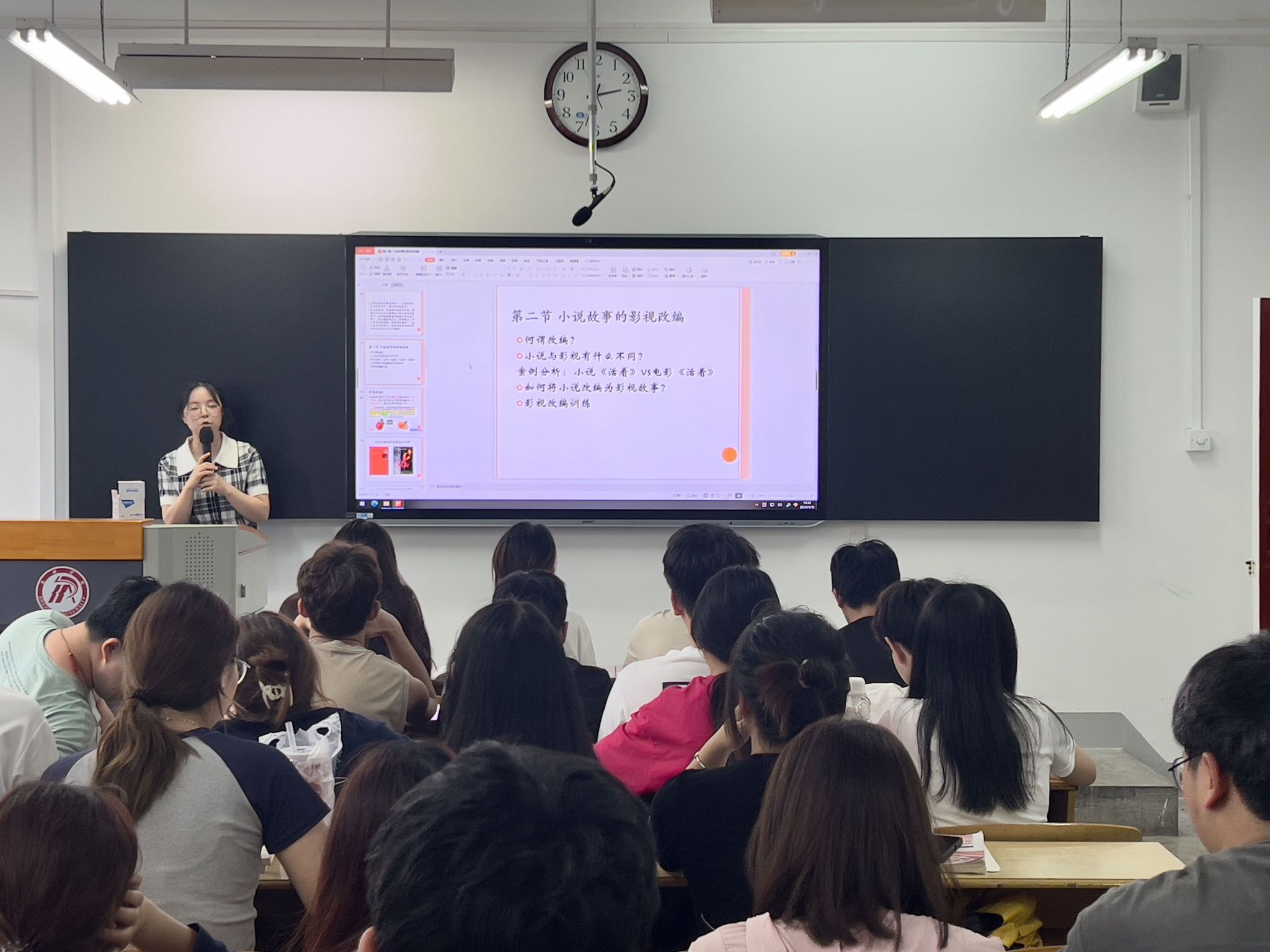活动第一环节是公开课观摩。教师们在1303教室观摩了鲁雨溦老师主讲的授课内容《小说故事的影视改编》,通过小说《活着》与电影《活着》的案例分析,讲授了小说改编为影视剧过程中叙述者的变化及主人公形象建构的方式异同,着力引导学生思考影视剧改编过程中的创意思维问题。