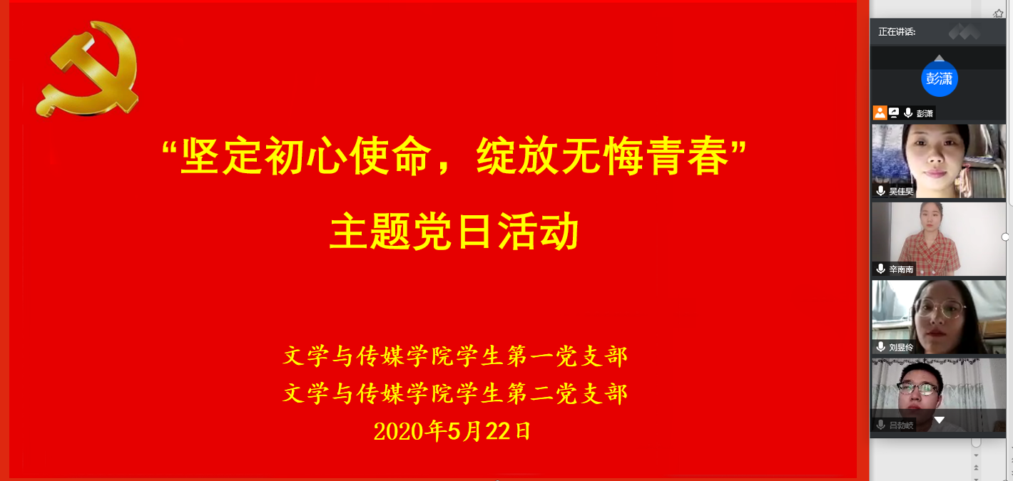 为进一步规范党内的组织生活,深入推进“两学一做”学习教育常态化、制度化,激励党员树立崇高理想,坚定理想信念,2020年5月22日下午16:30,koko体育官网学生第一、第二党支部通过线上形式,联合开展了“坚定初心使命,绽放无悔青春”主题党日活动。学生第一、第二党支部全体党员、第二十期发展对象参加了本次活动。活动由学生第一党支部书记彭潇主持。