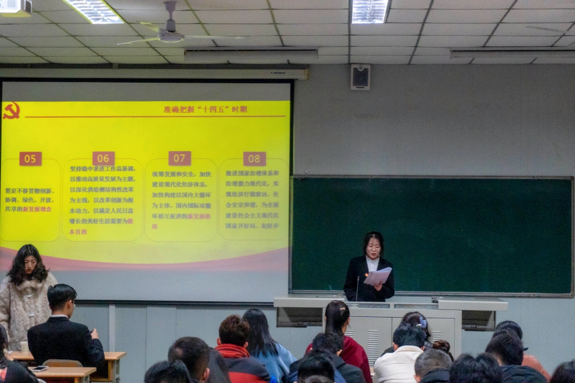 党的十九届五中全会擘画了我国未来发展的宏伟蓝图,作出了应对变局、开辟新局的顶层设计,在党和国家发展进程中具有全局性、历史性意义。宏伟蓝图鼓舞人心,学习宣讲凝聚力量。为全面落实党的第十九届五中全会精神,由学工部、马克思主义学院主办,koko体育官网协办的十九届五中全会宣讲活动于12月23日在江南校区10号教学楼1012室举办。koko体育官网党支部副书记杨海蓉、koko体育官网学生宣讲团成员、koko体育官网全体团学干部参加本次宣讲活动。活动由杨海蓉主持。