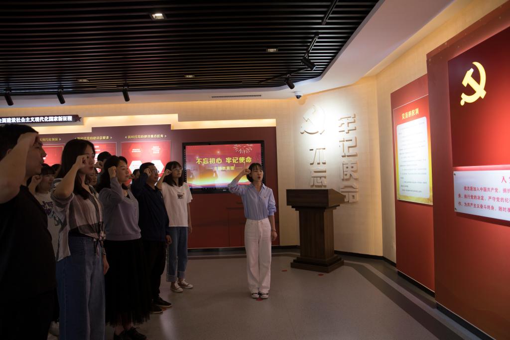 全体人员在学生党员姚凤玲的的带领下,重温了入党誓词。“我志愿加入中国共产党,拥护党的纲领,遵守党的章程,履行党员义务……”一句句铿锵有力的誓词,再次激发起了党员们在回望党的光辉历程中奋进新征程的昂扬斗志。