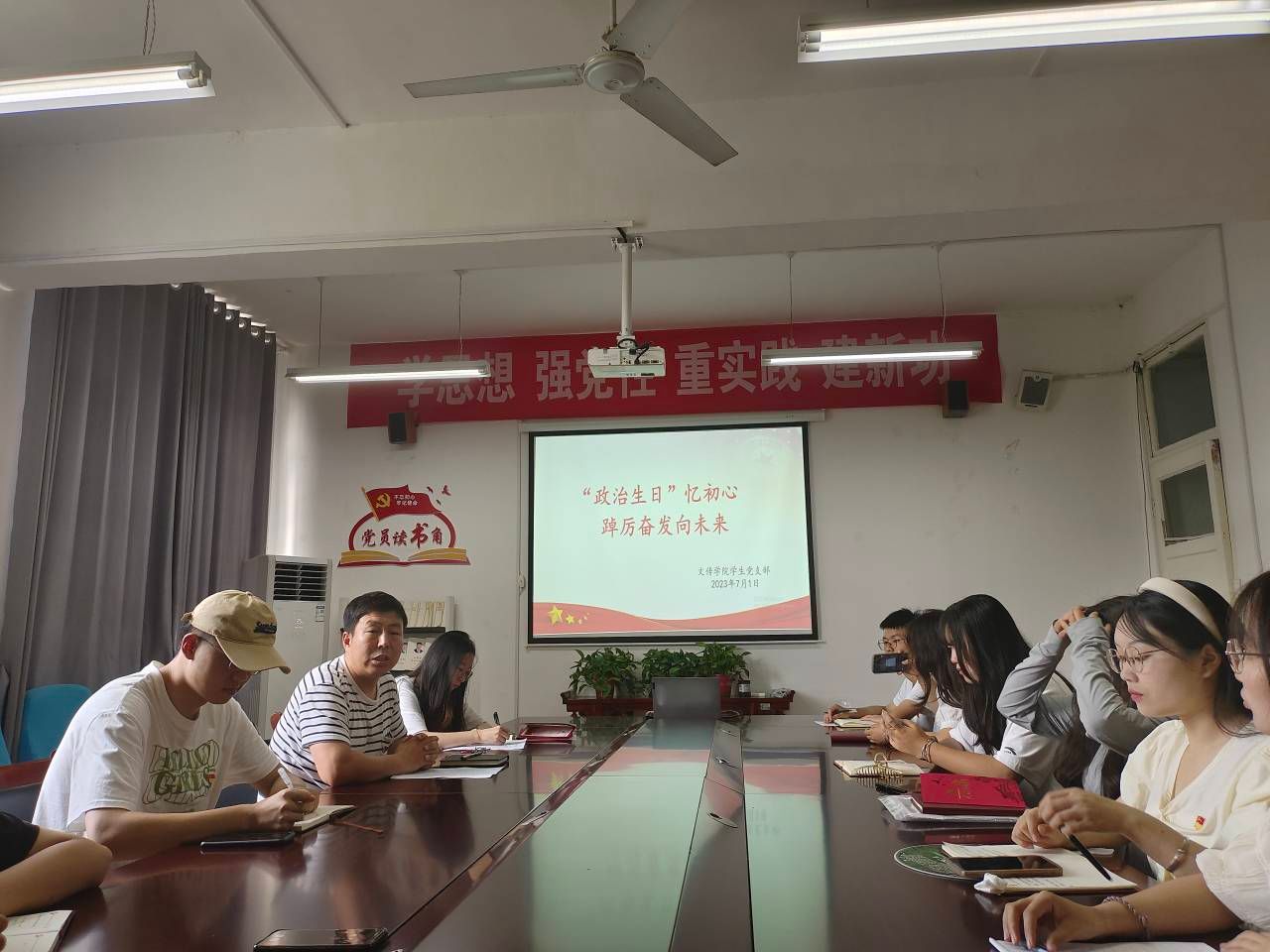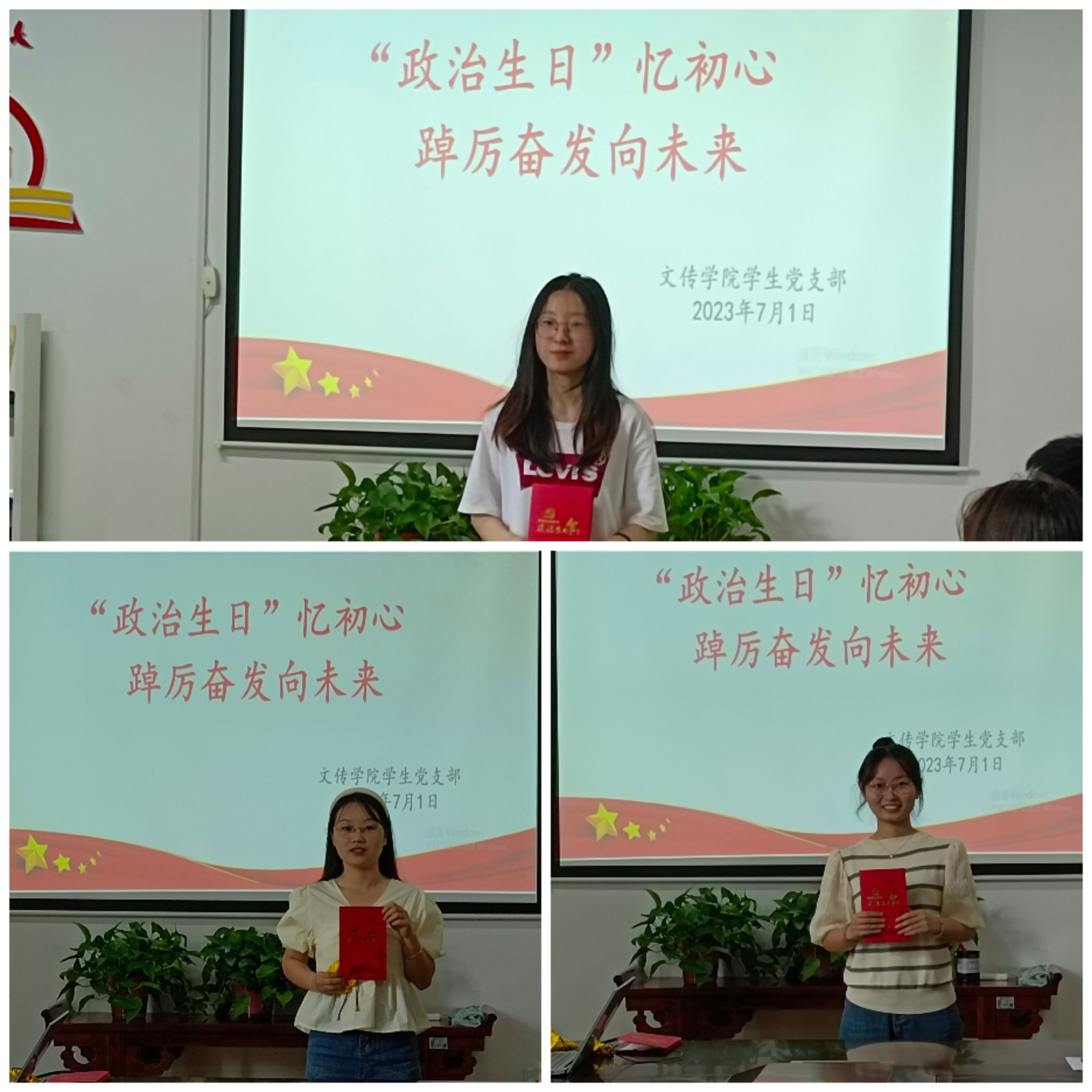 薛涛为毕业生党员分发政治生日贺卡和纪念印章。毕业生党员们依次分享入党初心故事。