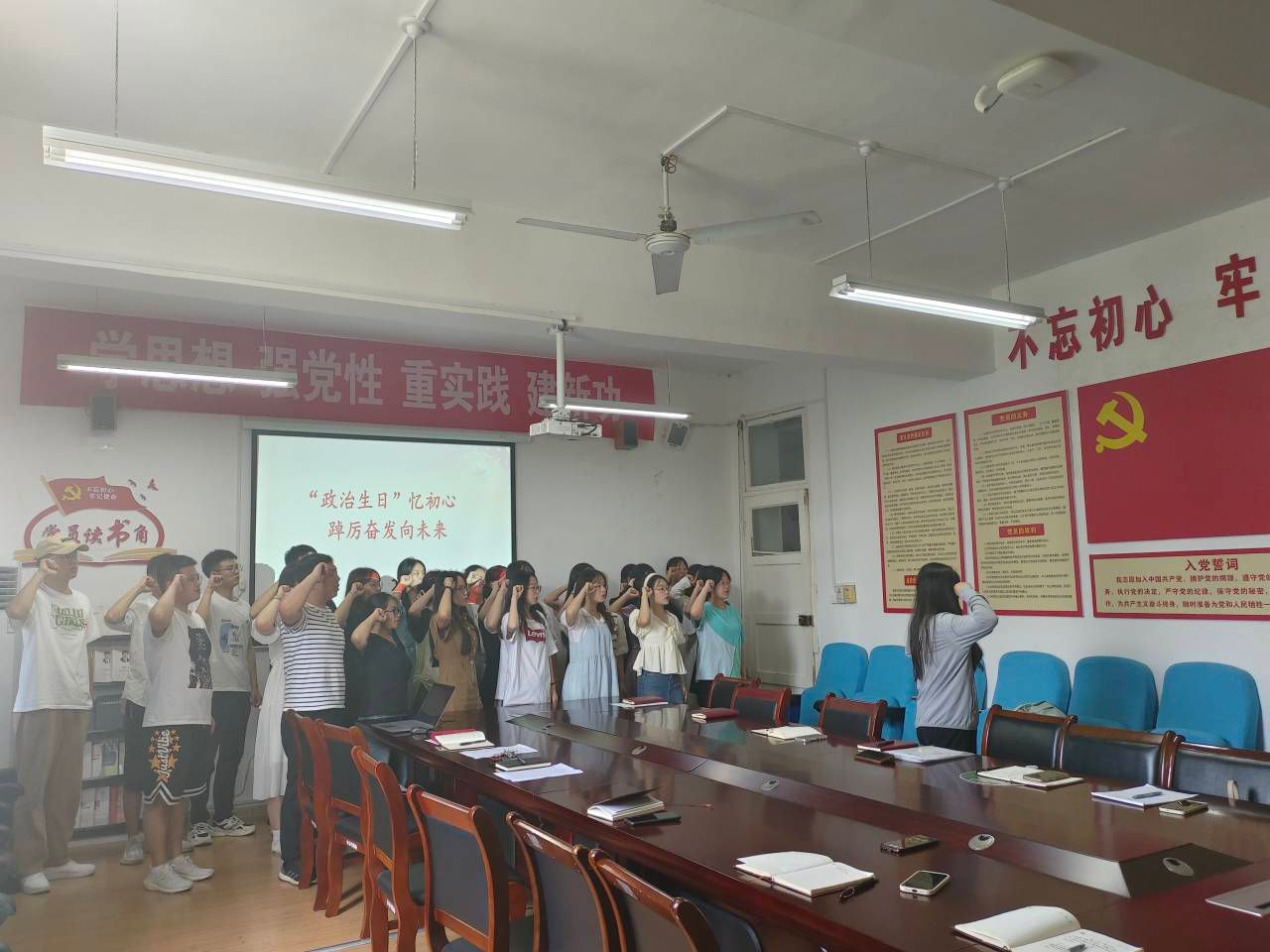 全体党员在路怡鸿同志的带领下面向党旗举起右拳,重温了入党誓词,用铮铮誓言彰显永恒初心,进一步坚定理想信念,永葆党员本色。在党旗下的庄严宣誓,回荡在会议室的入党誓词让每一位党员心潮澎湃,振奋不已。