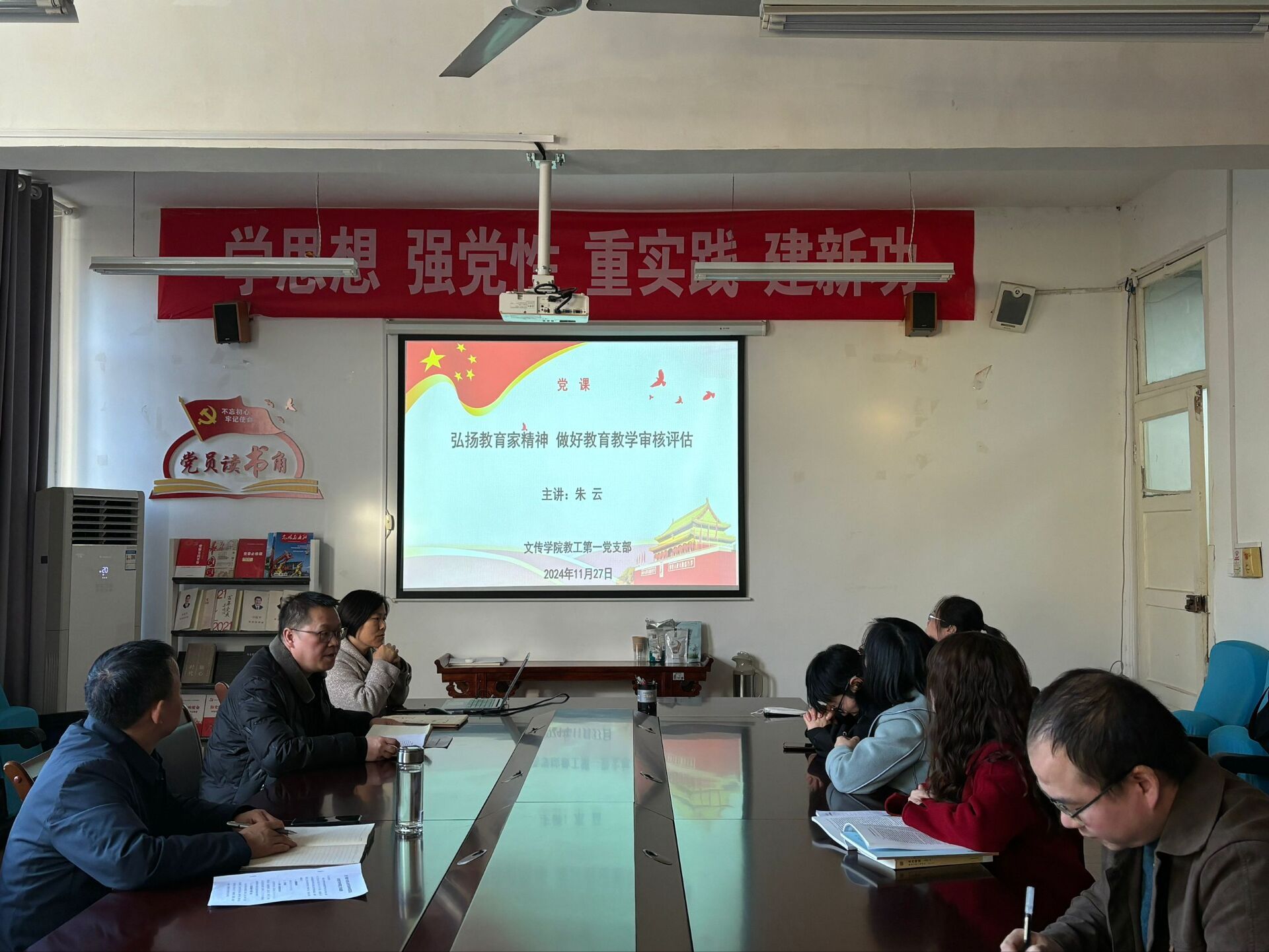 为深入学习贯彻习近平总书记关于教育的重要论述和全国教育大会精神,全面落实立德树人根本任务,贯彻学校本科教育教学审核评估工作推进会会议精神,2024年11月27日下午,koko体育官网教工第一支部组织全体党员开展“弘扬教育家精神,做好教育教学审核评估”11月主题党日活动,活动由支部书记韩文霞主持。