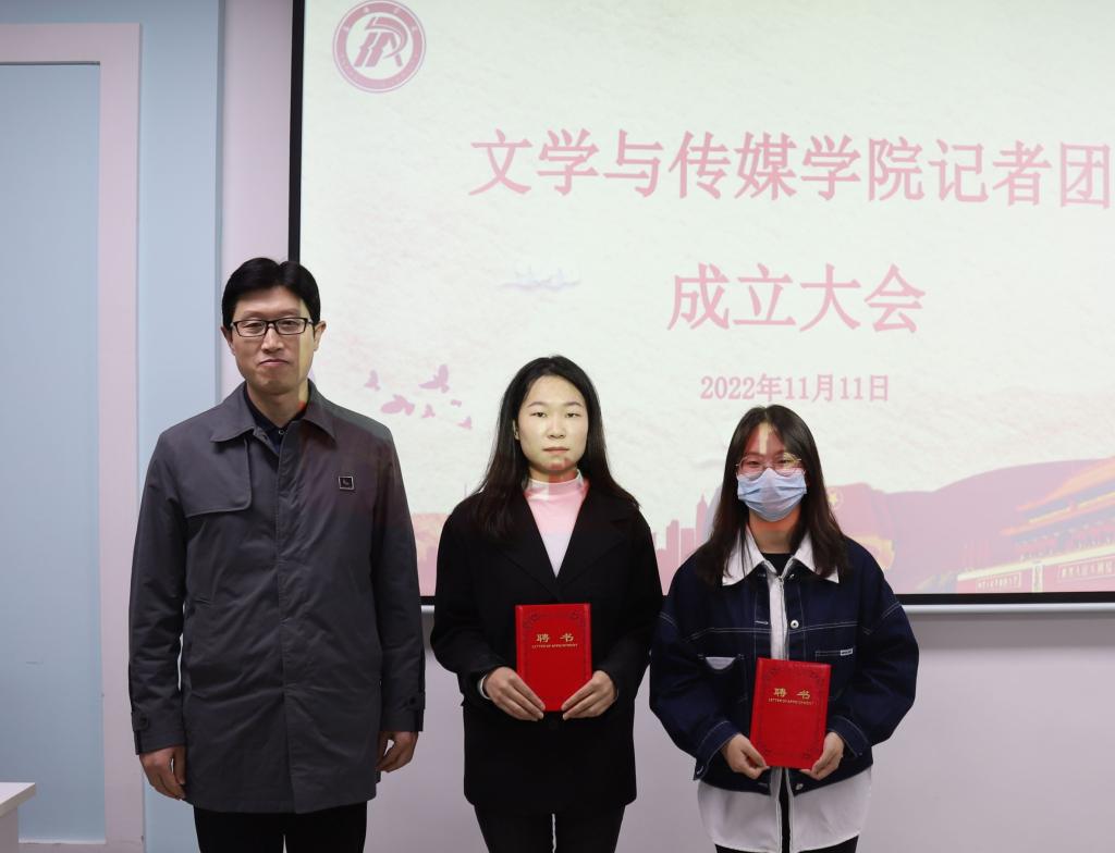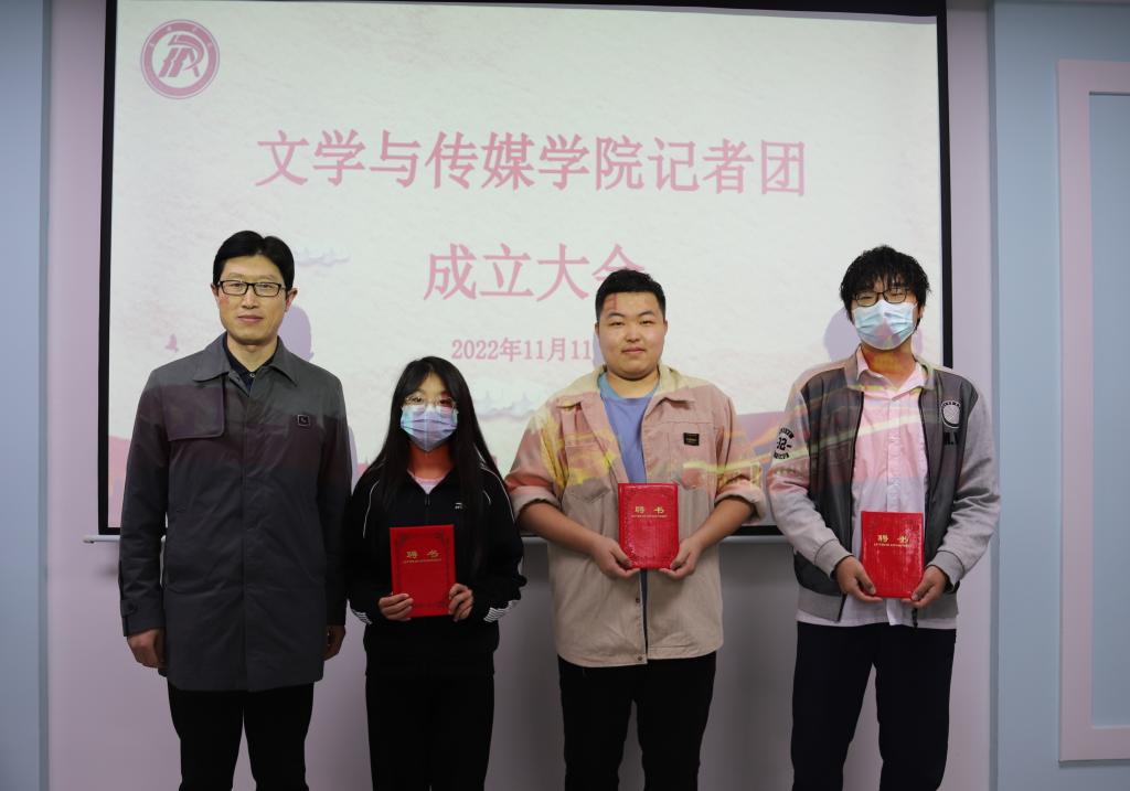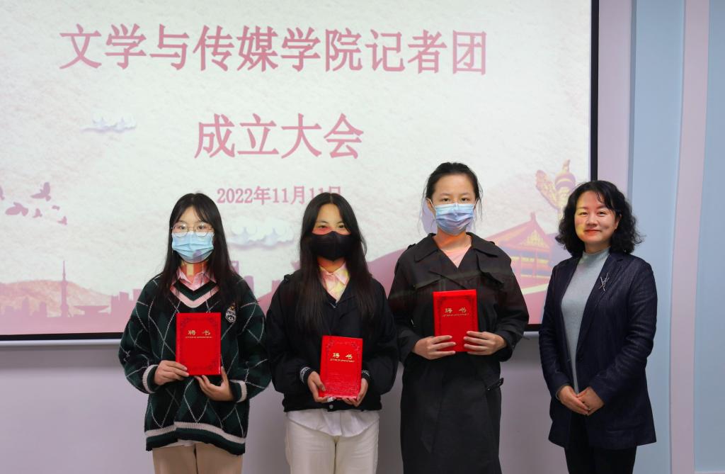 主持人宣读首届记者团成员名单后,在掌声中,芦伟和杨海蓉为他们颁发聘书并合影留念。