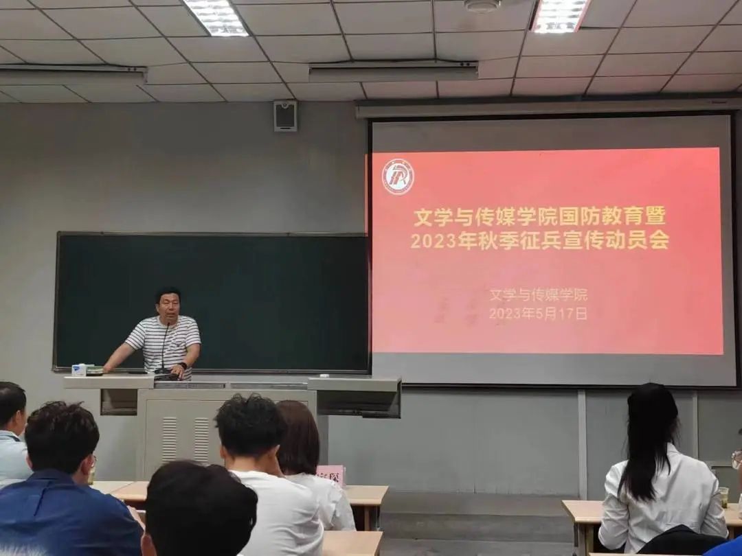 为深入贯彻二十大精神,加强学生国防安全教育,厚植青年学子爱国主义情怀,落实习近平强军思想,鼓励适龄青年积极响应国家号召投身军营报效祖国,文传学院联合学工部于5月17日晚上19点在江南校区十号教学楼1027教室组织开展国防教育暨2023年征兵动员会。学工部征兵工作负责人罗从政、koko体育官网学工办副主任薛涛,退伍大学生戴家琛、严庆及koko官网2020级全体男生参加本次动员会。会议由薛涛主持。