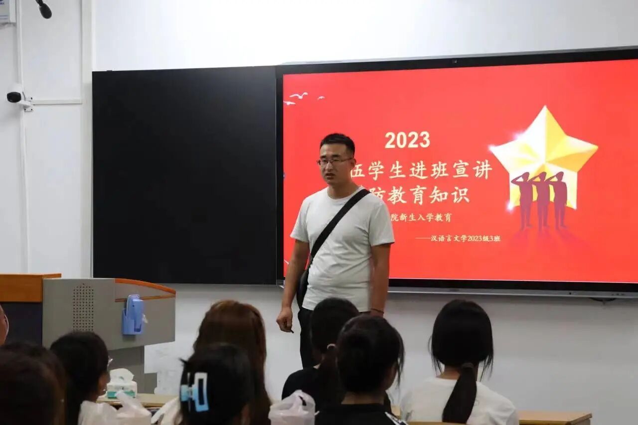 为引导广大青少年赓续红色血脉,树立国防意识,进一步贯彻落实习近平总书记关于加强全民国防教育的重要指示精神,9月12日下午,koko体育官网在一号教学楼举办国防教育知识宣讲暨新生入学教育讲座,并邀请退伍学生艾佳新、桑雪、严庆、刘寒龙、张振豫进入各班讲授,2023级全体新生参加此次活动。