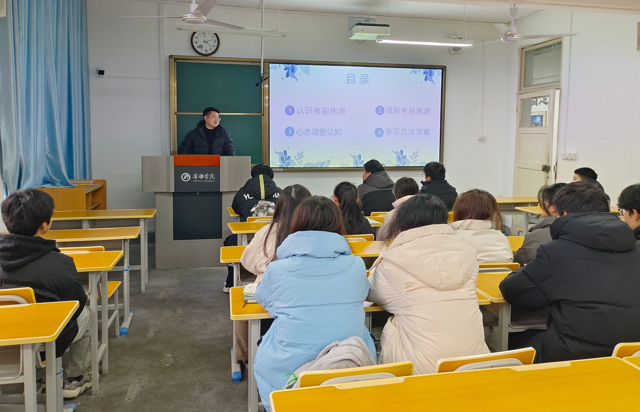 辅导员喻言、刘言军结合实际案例,深入浅出地讲解了焦虑情绪产生的原因、表现以及排解焦虑的应对方法。通过现场互动和问答环节,引导同学们正视自己的心理状态,学会主动调节情绪。