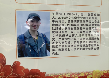 除了坚持自己专业方向的研究,王啟泽还注重提高自己的综合素质。研二时,他被任命为学院研究生会主席,协助老师举办了由陕西理工大学文学院(今人文学院)承办的第四届全国汉代文学研讨会、纪念黎锦熙先生诞辰130周年暨现代汉语语法研讨会、陕西·汉中2020语文教育论坛等大型学术会议,组织学院研究生“旱麓”学术论坛、“博望论坛”读书沙龙等活动,创办并成功举办了“天行健”系列文体活动,同时加入党员先锋队,为学校疫情防控、研究生招生考试考点考务工作、大型校级活动组织等贡献自己的力量。20219月,王啟泽作为志愿者在十四运汉中赛区天汉楼城市志愿者服务队参加志愿服务,获评汉中市2021年十四运志愿服务先进个人;同月,王啟泽累计参加无偿献血达100次,连续三届获得全国无偿献血奉献奖金奖,事迹被《汉中日报》报道。202112月,王啟泽被评选为陕西理工大学陕西省2022届优秀毕业研究生候选人(已在20226月公示)。可以说,王啟泽同学不仅受到身边师生的喜爱,在学院、学校范围起了引领作用,而且在省市学子,乃至全国文学地理学领域硕士研究生中,都传播着正能量,发挥了积极的意义。