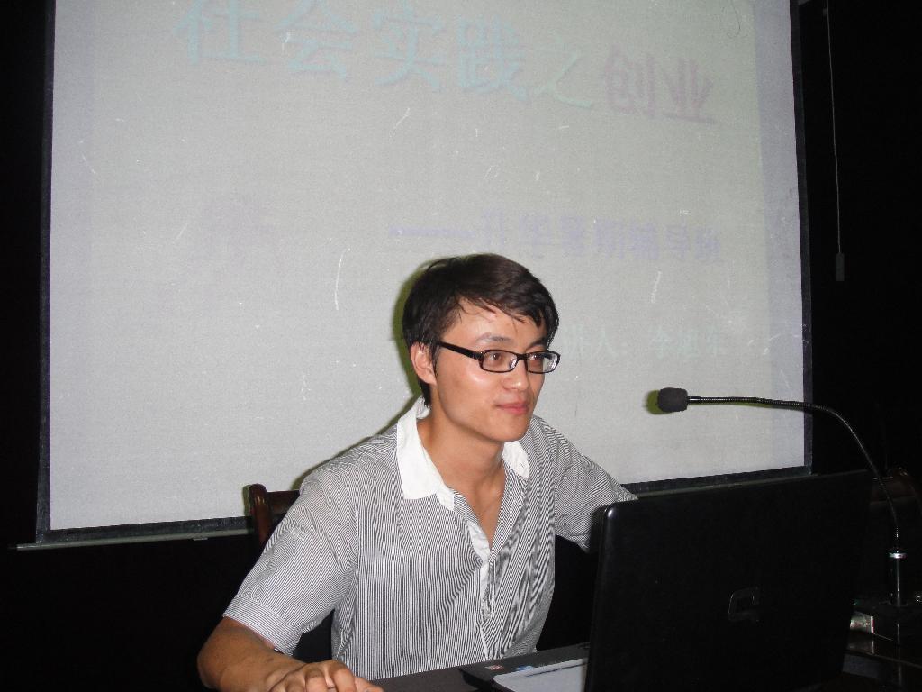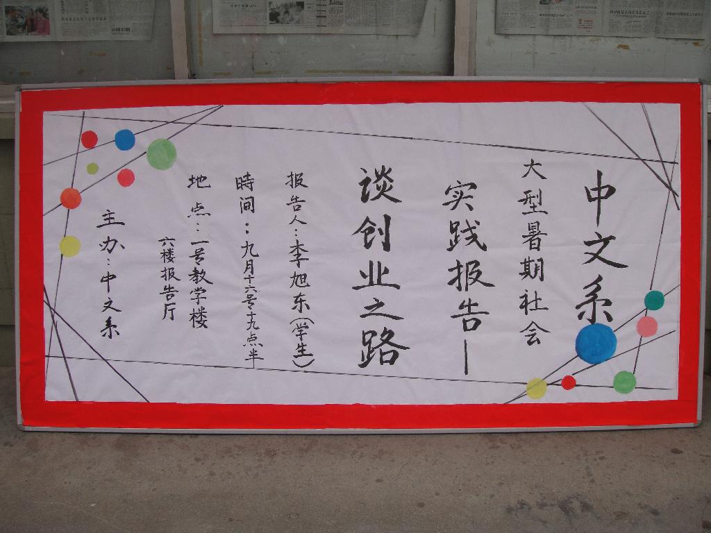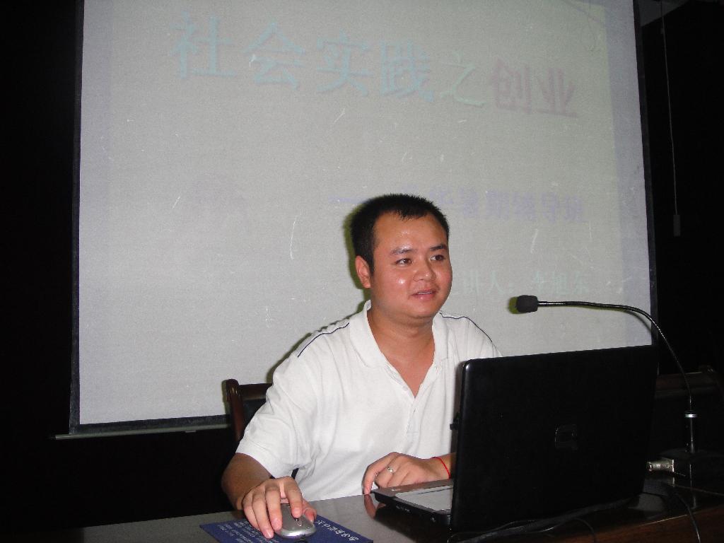 2010年9月16日19:30,在中文系韩晔老师的组织指导下,2009级语文教育1班学生李旭东在一号教学楼六楼报告厅做了一场题为“社会实践之创业”的报告会,交流他在暑期社会实践中的感受及经验。中文系副主任雷升录、辅导员韩晔老师莅临指导。