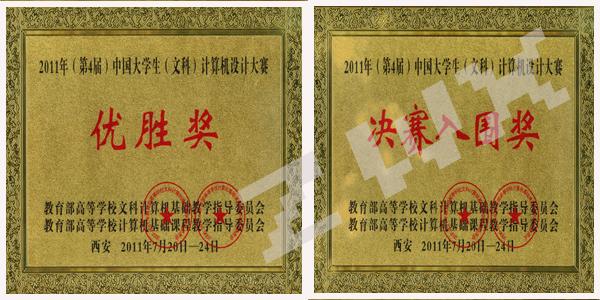 导航痕迹 首页 > 新闻通知 > 学院新闻 > 正文 学院新闻 通知公告 中文系学生苏刘蕊、郭敬一在第四届中国大学生(文科)计算机设计大赛中获奖 发布人: 发布日期:2011年09月16日 阅读次数: 7月21日—24日,由教育部高等学校文科计算机基础教学指导委员会、教育部高等学校计算机基础课程教学指导委员会联合主办的“2011年(第4届)中国大学生(文科)计算机设计大赛”决赛在西安电子科技大学、西北大学和陕西师范大学举行。 我系09级文秘专业同学苏刘蕊创作的电子杂志《家园》经过现场答辩、评审专家严格评审,获优胜奖,08级汉语言文学专业郭敬一同学创作的课件《安康民俗》获决赛入围奖。