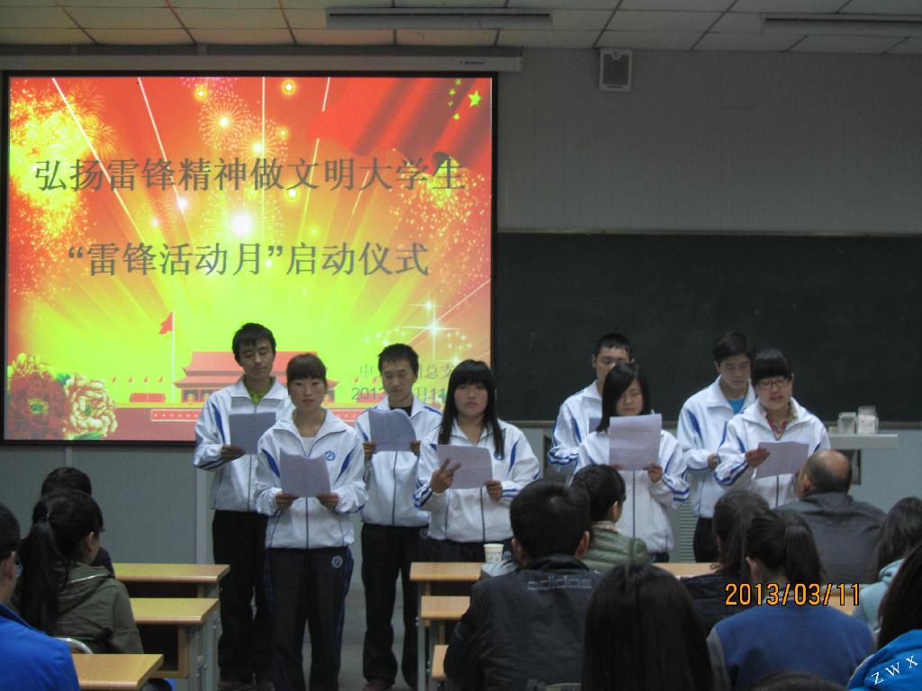学生代表李青松同学宣读了“弘扬雷锋精神做文明大学生”的倡议书,班级代表进行了“学习雷锋精神”诗歌朗诵,倡议同学们学习雷锋从小事做起。
