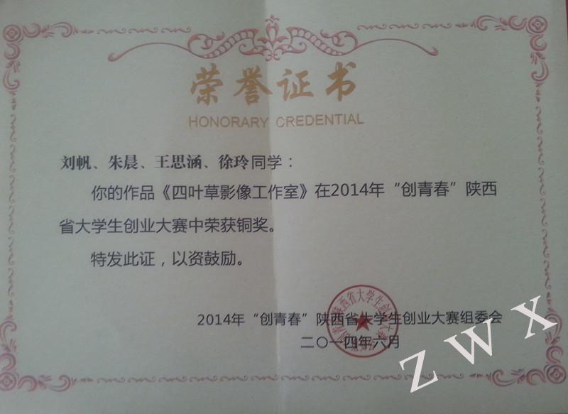 2014年6月,在共青团中央、教育部、国家人力资源和社会保障部、中国科协、全国学联共同组织开展的“创青春”全国大学生创业大赛中,由邹棠华老师指导、中文系学生刘帆、朱晨、王思涵、徐玲申报的“四叶草影像工作室”创业项目荣获陕西省大学生创业大赛铜奖。