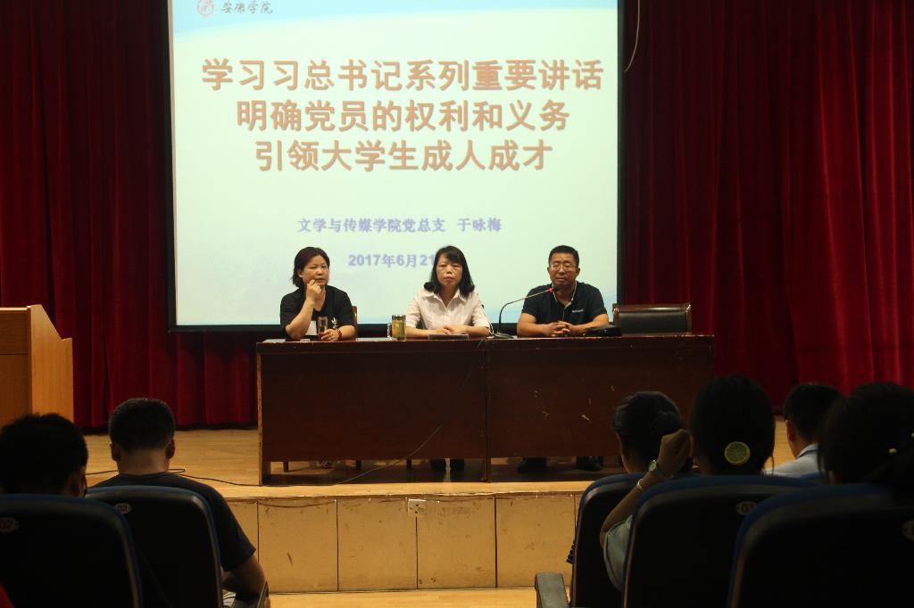 接下来于咏梅通过提问的方式让同学们对加入党组织的条件和中国共产党党员的条件等问题进行了再学习,并对党员的八条权力与八条义务进行了详细讲解,明确地指出了党员权利与义务的辩证关系。“没有无义务的权利,也没有无权利的义务”。党员的义务和权利相互联系,相互依存,相辅相成。履行义务是行使权利的前提,行使权利是履行义务的保证。同时于咏梅还提出四点具体要求:第一,要在加强学习上再下功夫。“两学一做”学习教育基础在学,学生党员除参加党支部组织的集体学习外,还可以结合自己的时间,采取网上自学、做读书笔记等多种方式,认真学习党章、党的政策法规条例、习近平总书记的系列讲话精神,做到真学、真懂、真信、真用。第二,要在坚定理想信念上下功夫。作为新时代的中国青年,应围绕立德树人的中心,始终保持一颗“要立志做大事,不要立志做大官”的赤子之心,树立同这个时代主题相契合的理想信念,勇于承担时代赋予的历史责任。作为本科生,学生党员们应该在学习上奋发图强,在生活上无惧磨难,更应该在自己人生目标的选择上志存高远。学生干部们更要发挥带头作用,积极参与志愿活动,热情帮助周围的同学,坚定自己的理想信念,用正能量去影响身边的人。第三,要在学会做人和做事上下功夫。学生党员们要学会做人、学会做事、学会学习、学会生存。第四,要在争做“四讲四有”合格党员上下功夫。要讲政治、有信念,做到政治合格;讲规矩、有纪律,做到纪律合格;讲道德、有品行,做到品德合格;讲奉献、有作为,做到发挥作用合格。