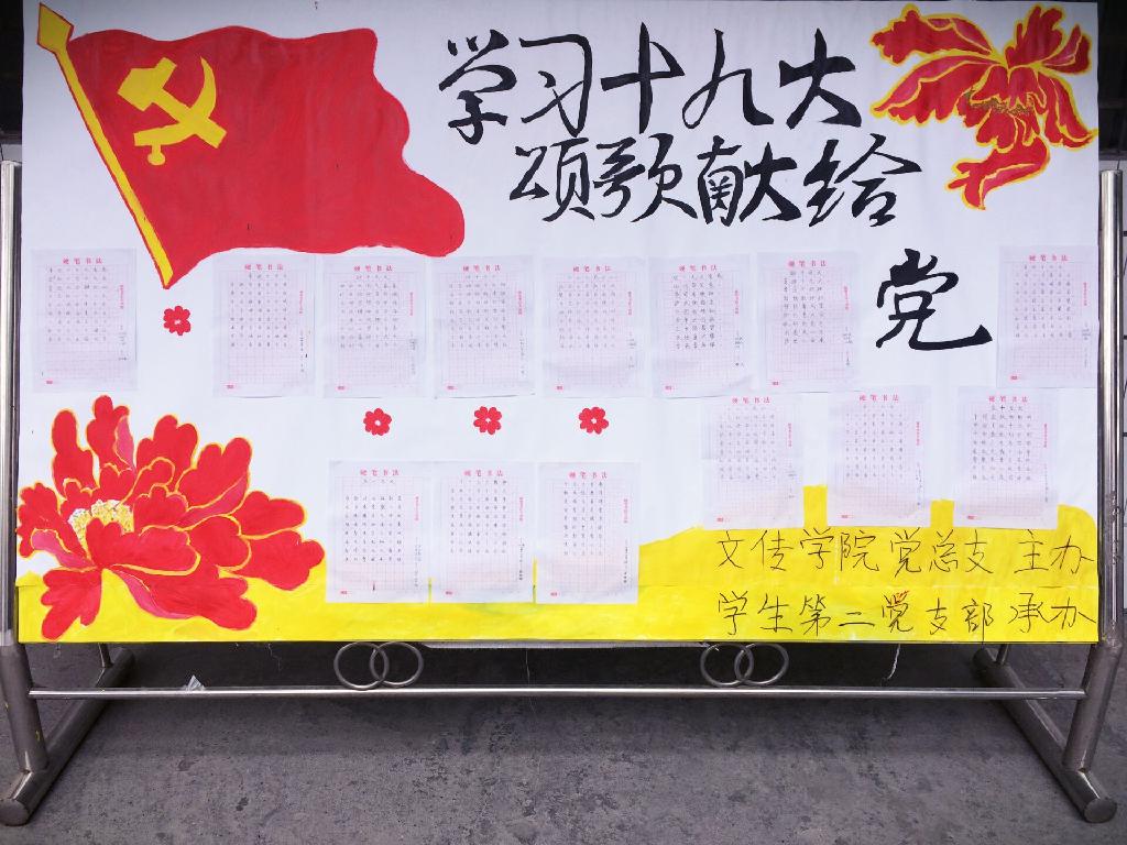 在全校上下掀起学习宣传贯彻落实党的十九大精神热潮之际,为凝聚青年共识,发挥青年力量,培养大学生爱党爱国情怀,引导青年大学生听党话、跟党走,在实际行动中践行伟大精神、贡献青春智慧、展现青春风采。由koko官网总党支主办,学生第二党支部承办,koko体育官网教师郑继猛指导,学生第二党支部的学生党员、积极分子根据学习十九大精神的心得体会结合所学专业知识,所精心撰写的“学习十九大 颂歌献给党”主题诗歌创作展于12月11日—12月17日在二号教学楼林荫道展出。