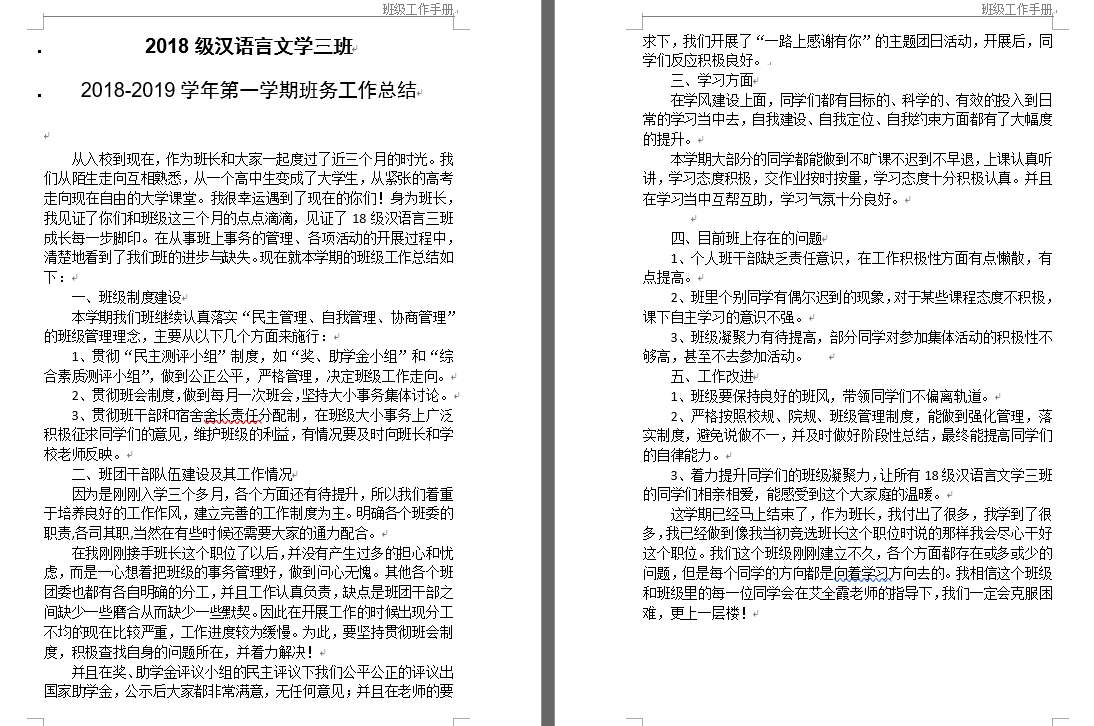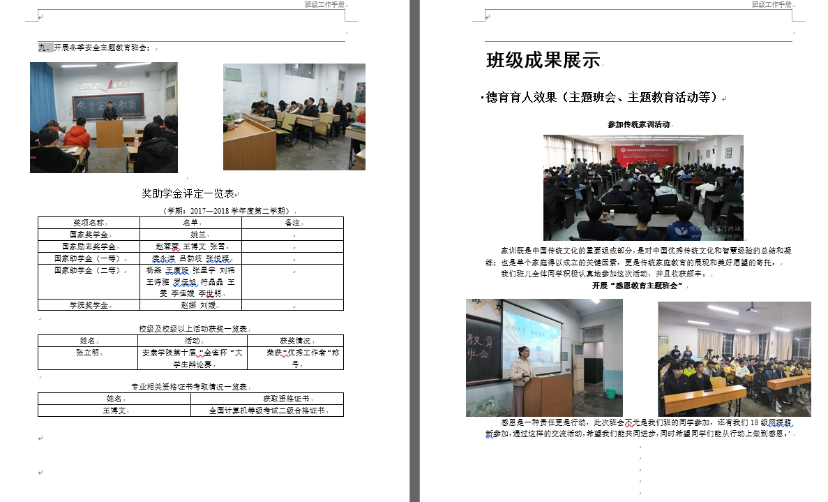 koko体育官网一直以来高度重视班级建设工作,从2016年下半年开始,结合实际制定了班级工作手册模板,要求每个班级每学期末交一份班级手册,强化班级建设,在提班风改舍风促学风上取得了一定实效。为强化班级建设,连续三年举办学生干部培训班,各班班长团支书全员参加培训,提升班级学生干部的工作能力与整体素质。此外,重视制度建设,开展文明班级(五四红旗团支部)评选活动,各班级纷纷创优争先,完善班级制度,凝聚班级力量,培育班级文化。在文明班级创建过程中,通过一学期一本的班级工作手册,全方位多层次宽领域全面记录班级这一学期的成果与不足,对班级一学期工作进行总结与反思,激励班级下一学期保持优点,改进不足,同时也方便班级资料查找,为大学生活留下宝贵可触碰的记忆。