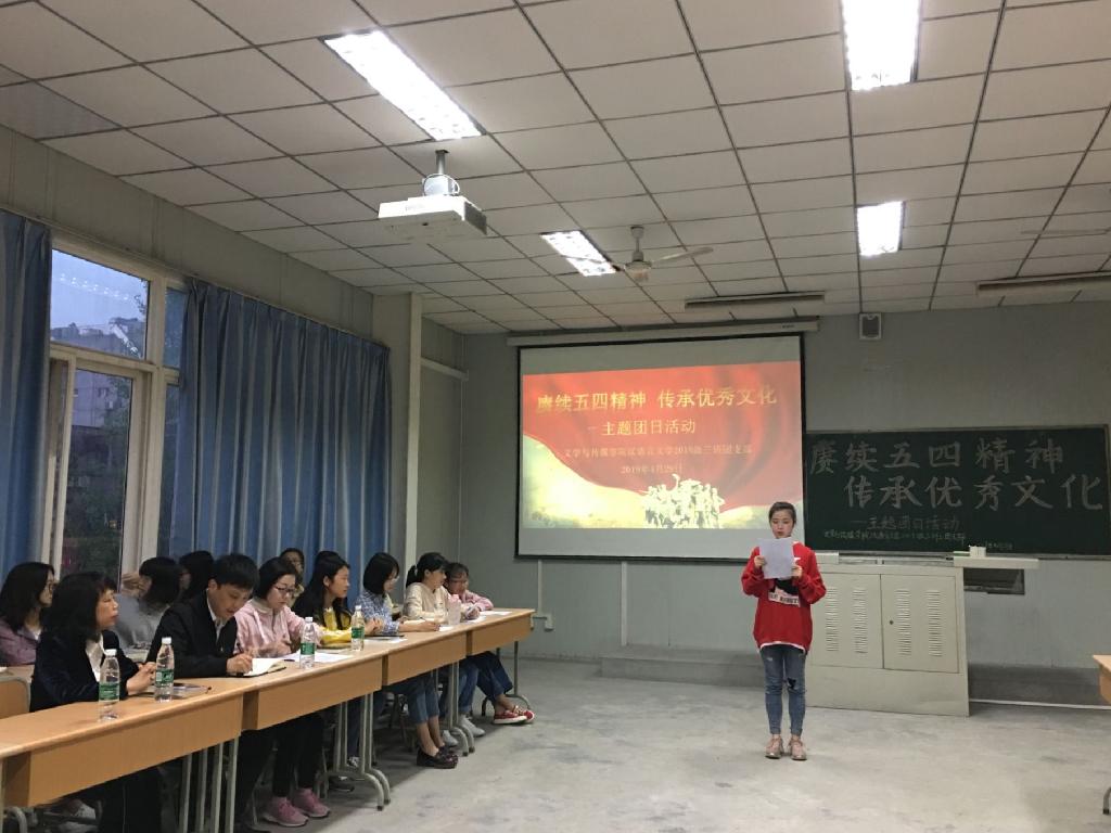 为纪念五四运动100周年,深入学习习近平总书记在中共中央政治局第十四次集体会议讲话精神,加强对五四运动和五四精神的学习理解,4月29日晚上七点半,koko体育官网2018级汉语言文学专业3班在1024教室开展了“赓续五四精神,传承优秀文化”主题团日活动,koko体育官网团委书记李光梓,koko体育官网党总支书记于咏梅,团总支书记、学工办主任沈菲,koko体育官网辅导员艾全霞,以及汉语言文学2018级3班全体同学参加了本次活动。