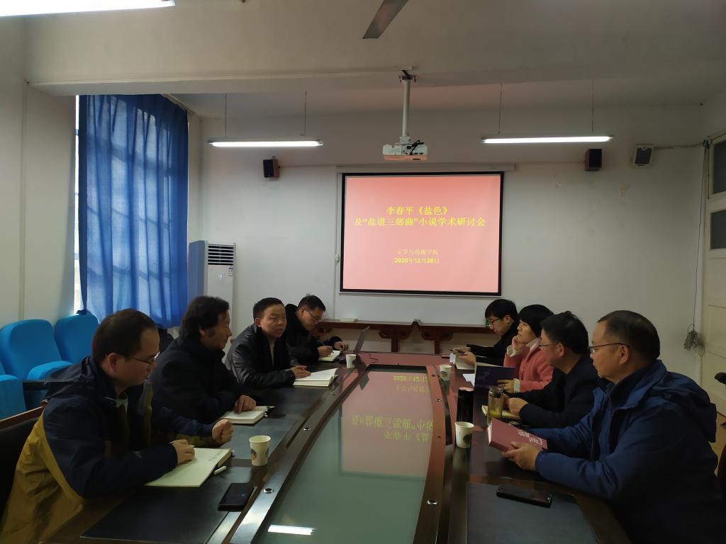 杨院长讲话之后,与会教授和博士围绕《盐色》及“盐道三部曲”的思想和艺术成就,进行了深入交流和探讨。郑继猛教授以“《盐色》的当代价值”为题,探讨了《盐色》对秦巴乡贤文化的挖掘,以及这种挖掘对当代乡村文化振兴的启示价值;周龙田副教授以“无意的忽略:《盐色》的叙事选择”为题,探讨了《盐色》在革命叙事和土匪叙事上的匠心和特色;韩文霞副教授以“‘盐道三部曲’:特异的历史叙事”为题,分析了李春平历史叙事中的日常生活描写,高度肯定了李春平小说对秦巴地域文化的挖掘;曹刚博士以“‘盐道三部曲’的小说美学特征”为题,运用温克尔曼“平淡的崇高、静穆的伟大”观点,分析了《盐色》及“盐道三部曲”的形式美学特征及其当代价值;谭诗民博士以“李春平小说的承与变”为题,分析了“盐道三部曲”对传统小说的继承,及其在空间叙事上的创新拓展;雷升录副教授以“李春平的小说世界”为题,从故事讲述和民间立场两个角度,分析了“盐道三部曲”的艺术特色;崔德全博士以“声音和《盐色》:《盐色》的象征”为题,分析了《盐色》中的词牌名标题与小说思想内容的象征勾连。