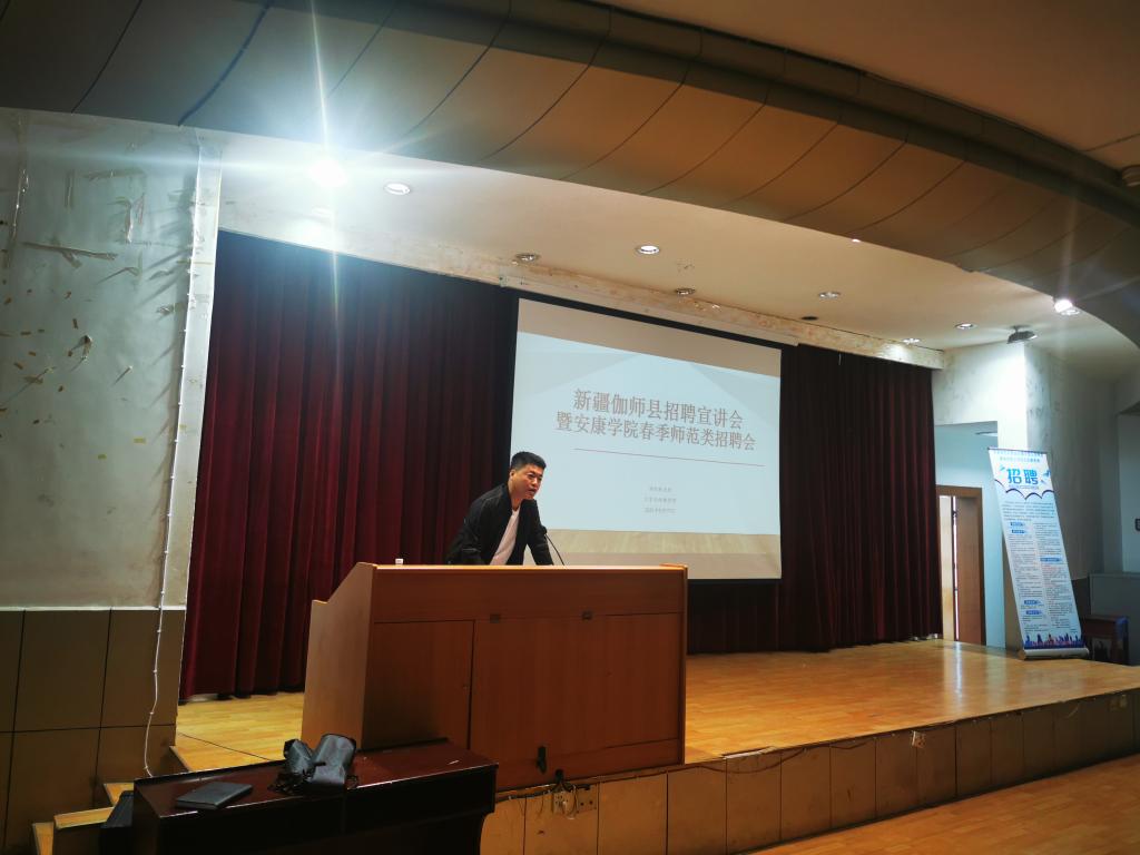 会上,陈东老师代表伽师县教育局向我校师范类毕业生详细解读了本次招聘岗位设置的要求。他通过分享自己的个人经历,讲解相关的国家优惠福利政策,播放伽师县宣传片,解答同学们的疑虑,使同学们对伽师县以及当地的教育环境有了深入地的了解。他分别就薪资待遇、岗前培训、住宿安排、签订合同、聘后管理为同学们做了详细的内容介绍。质朴的语言,真挚的情感深深地打动了在场的学生,同时也让学生从更多元化的角度对伽师县招教有了更高层次的认知,同学们积极热情地向陈老师询问招聘的详细内容。