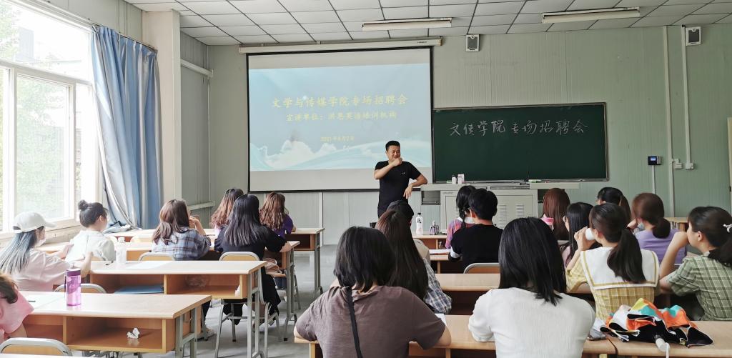 洪恩英语培训机构的王子勃、刘苗两位老师从调研学生就业动向入手,联系职业生涯规划,激励同学们厘清自身角色定位,脚踏实地、把握机遇。接着,介绍了公司的工作环境、招聘岗位、薪资待遇、发展空间、企业文化等方面的情况,耐心地解答了同学们对岗位的疑问。招聘会现场交流互动热烈,毕业生积极与老师沟通,表达自己的应聘意向。
