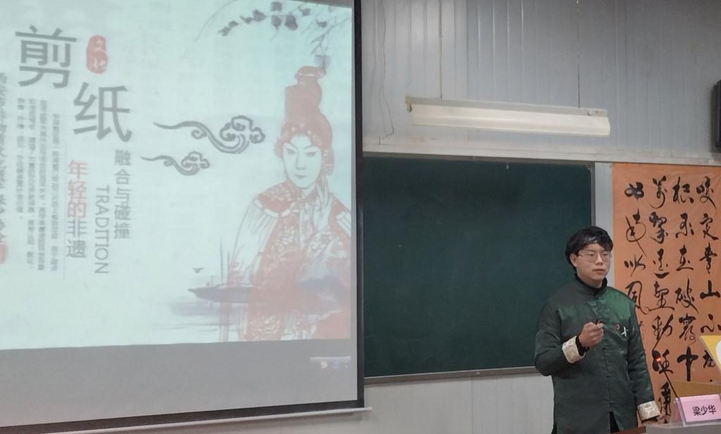 讲座伊始,梁少华为同学们播放了剪纸纪录片《身临“秦”境》带领着大家走进剪纸世界。由剪纸的起源、历史沿革、分类、基本纹样再到其中蕴含的民间智慧,无一不体现着剪纸文化的巨大魅力。梁少华还向同学们展示自己的剪纸作品并且带领大家深刻体验剪纸文化。