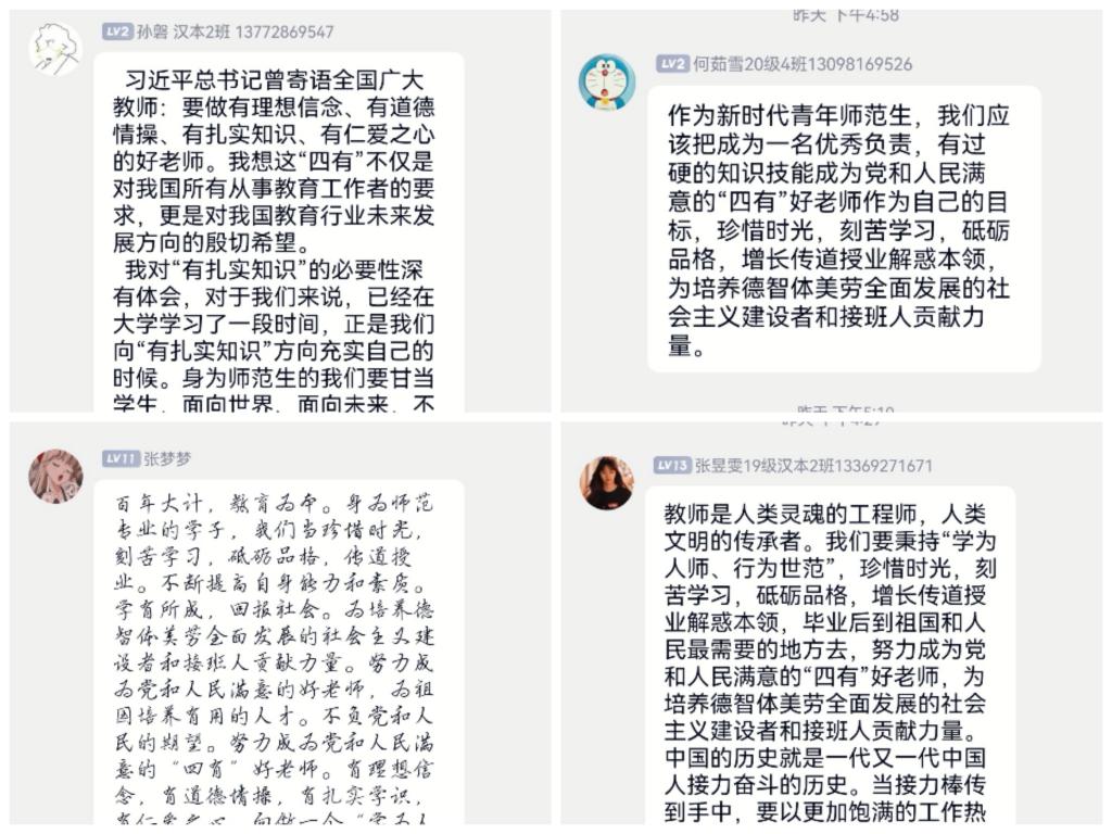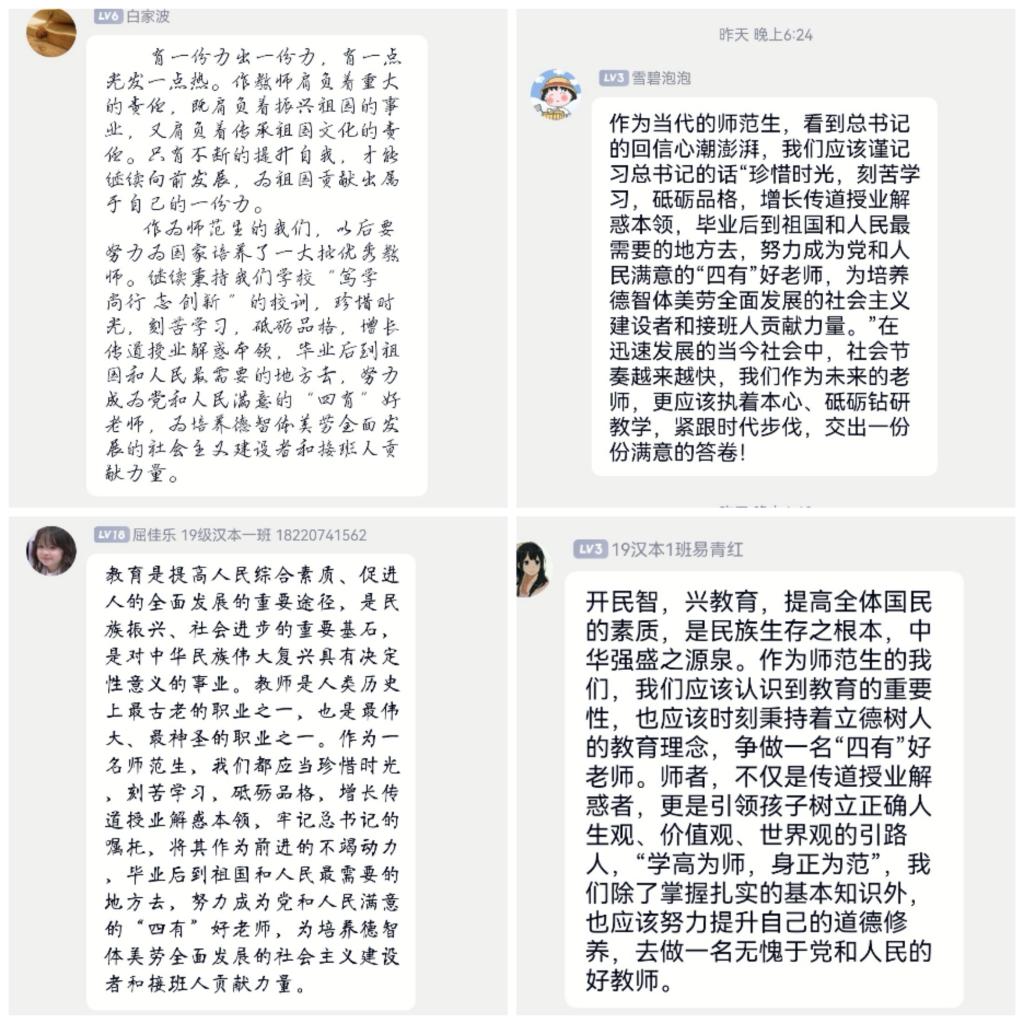 习近平总书记的回信,充分体现党和国家对祖国教育事业的关心,对师范生的殷切期望。教育是国之大计、党之大计,教师是人类灵魂的工程师,担负着教书育人、传播人类文明、培养合格人才、提高民族素质的重任。koko体育官网通过线上形式组织汉语言师范生认真学习并热议总书记的回信,分享学习心得体会,大家纷纷表示一定会牢记习近平总书记的殷切嘱托,珍惜国家和学校提供的优质资源,坚定师范报国志向,在教学实践中增长才干、砥砺品质,让青春之花绽放在祖国和人民最需要的地方。