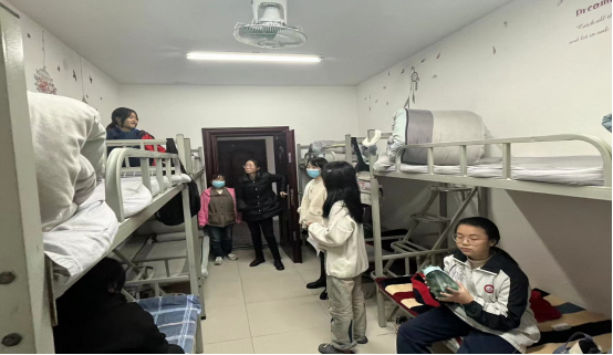 (图五:实习团队副组长刘丹和指导老师一起在宿舍看望学生)