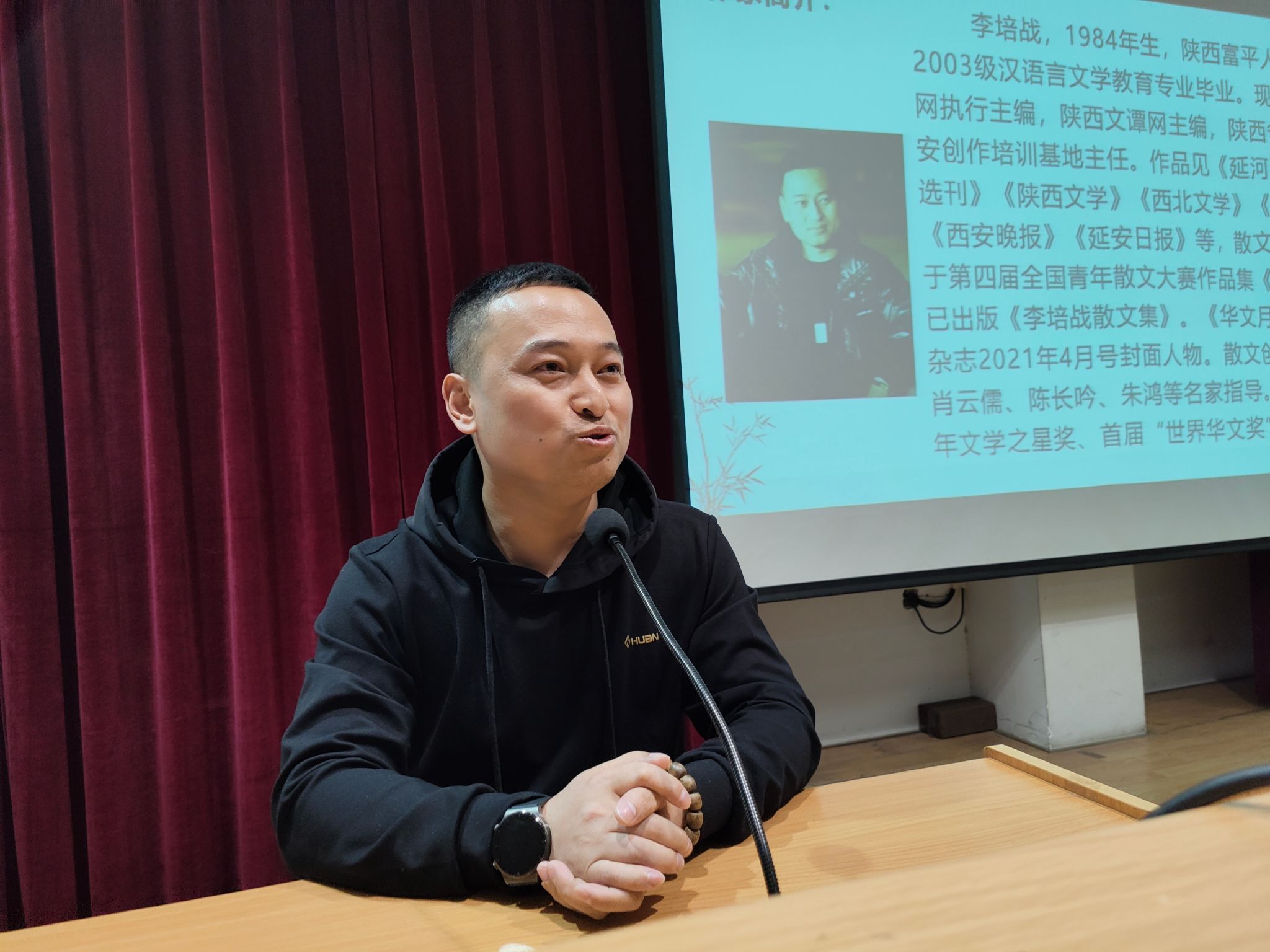为充分发挥校友榜样力量,聚合校友资源强化育人,2023年4月12日下午,koko体育官网邀请汉语言文学专业2006届校友、现任陕西散文网执行主编、陕西文谭网主编、陕西省散文学会延安创作培训基地主任李培战在一号教学楼六楼报告厅举办文学创作报告会。koko体育官网院长杨运庚、党总支副书记杨海蓉、辅导员邹棠华,影视戏剧社、文学创作社、风华诗社共计二百余人到场聆听。本次报告会由杨海蓉主持。
