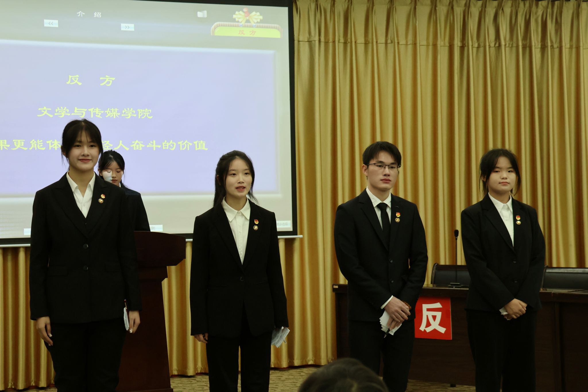 立论阶段,文传一辩王淼开篇进行题解,通过奋斗的价值在于取得多少成果,结果导向的前进性与发展性得出“结果”更能体现年轻人的奋斗目标。攻辩过程中,二辩戴林超、三辩杨紫琪引经据典,用苏轼、蒲松龄、祥子、公司投资的选择等案例展开激烈反攻,双方针锋相对,但又不失风度,结合具体案例据理力争。在激烈的自由辩论中,我方强调结果导向开辟新赛道,辩手们各抒己见,思想碰撞起激烈的火花,辩论达到高潮。总结陈词,我方四辩巩固己方观点,站在青年与国家的角度,表明青年奋斗正是以“伟大复兴”的结果为导向,为社会发展作贡献。台上对立答辩,台下掌声雷动。文传学子们旁征博引、纵横古今、口若悬河,为大家带来一场听觉的盛宴、思想的狂欢。评委老师本着“公开、公平、公正”的原则,认真评分。