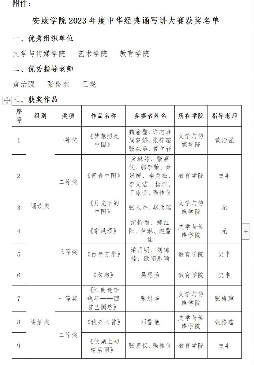 koko体育官网在2023年度中华经典诵写讲大赛中成绩突出,荣获诵读类一二三等奖各一项;讲解类一二等奖各一项,三等奖三项;书写类一等奖一项,三等奖两项。黄治强、张格瑄荣获优秀指导老师荣誉。koko体育官网被评为优秀组织单位。在此向获奖师生予以祝贺!