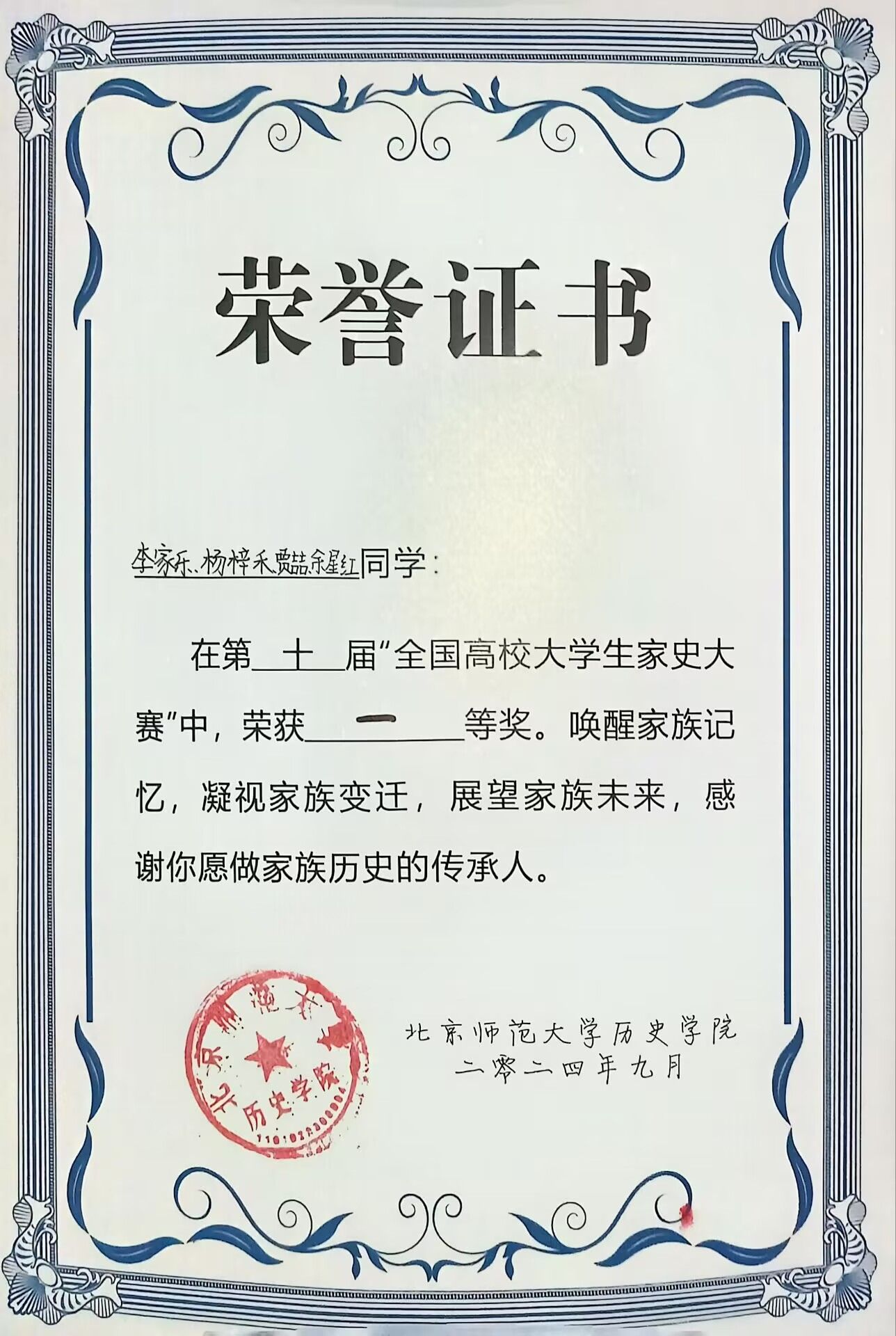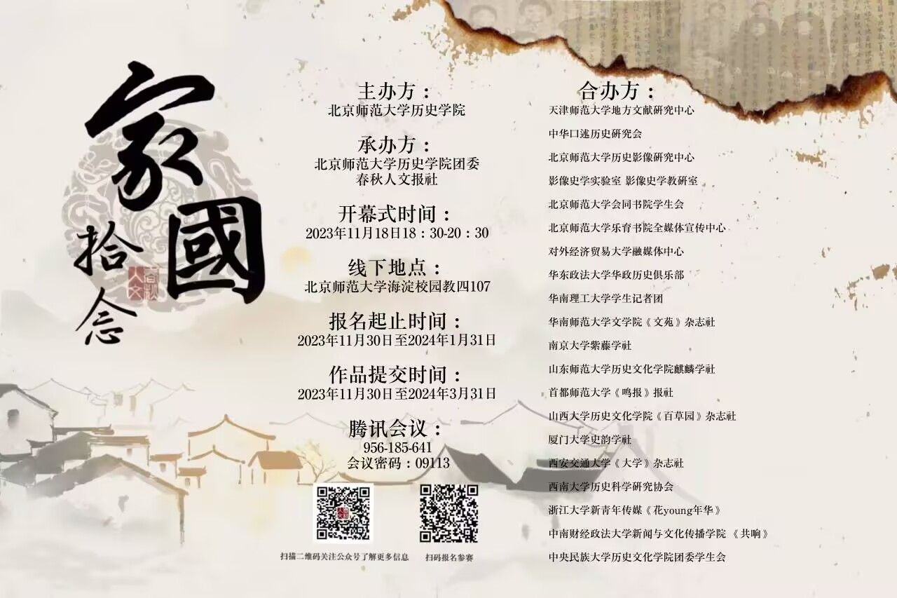 据悉,本次比赛以“家国拾念”为主题,由北京师范大学春秋人文报主办,北京师范大学历史影像研究中心、西安交通大学《大学》杂志社等诸多高校组织和团队合办,得到全国高校有志于家史搜集、记录、研究的同学广泛参与。