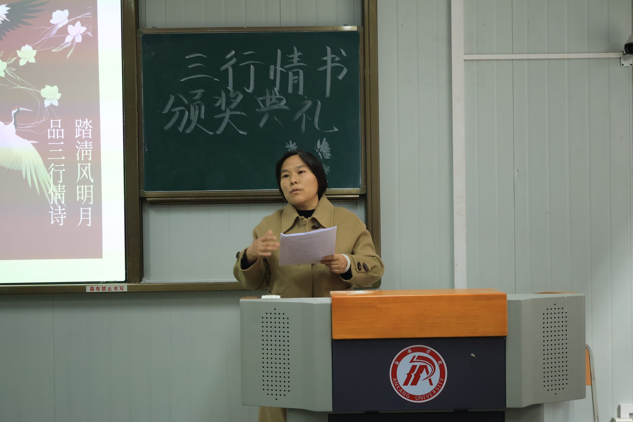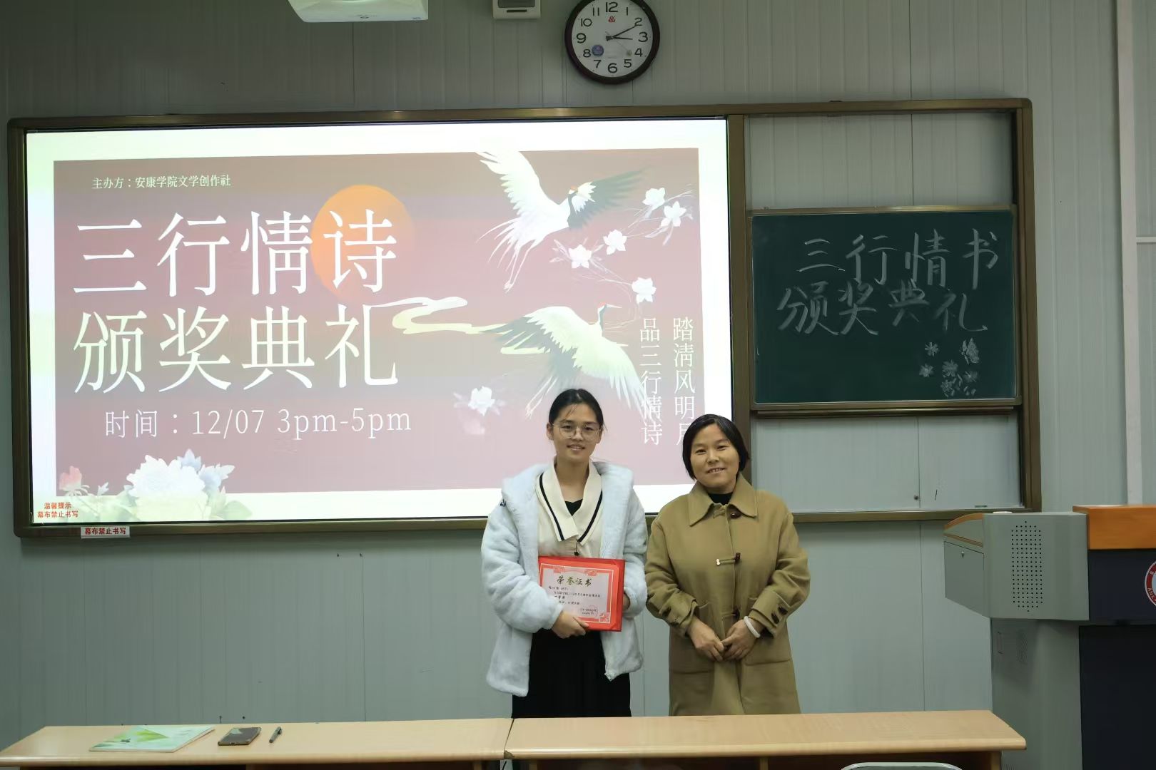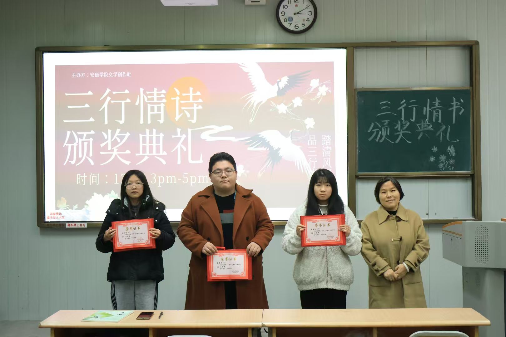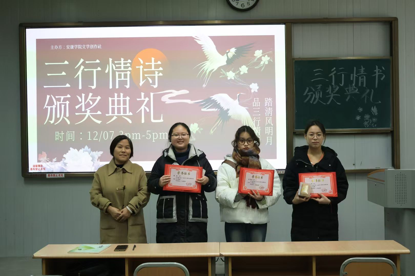 为了激发学生的创作热情,提升学生的文学素养,近期文学创作社举办了“三行情诗”大赛。经过评选,12月7日下午在江南校区1013教室举行颁奖典礼,社团指导老师韩文霞及社团全体成员和获奖人员参与活动。