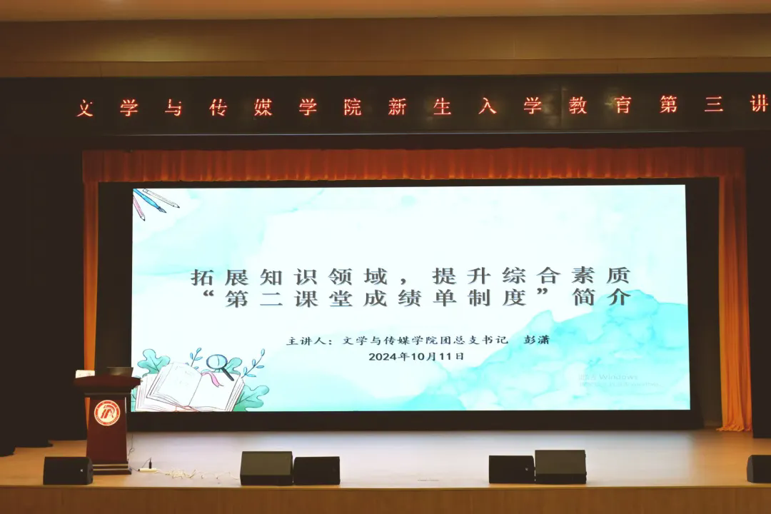 为全面提高新生综合素质,以完备、科学的“第二课堂成绩单”制度体系提升第二课堂育人实效,2024年10月11日下午,koko体育官网在江南校区大礼堂开展新生入学教育第三讲:拓展知识领域,提升综合素质——“第二课堂成绩单制度”简介。koko官网团总支书记彭潇主讲,辅导员喻言、刘言军和2024级全体同学参加,会议由刘言军主持。