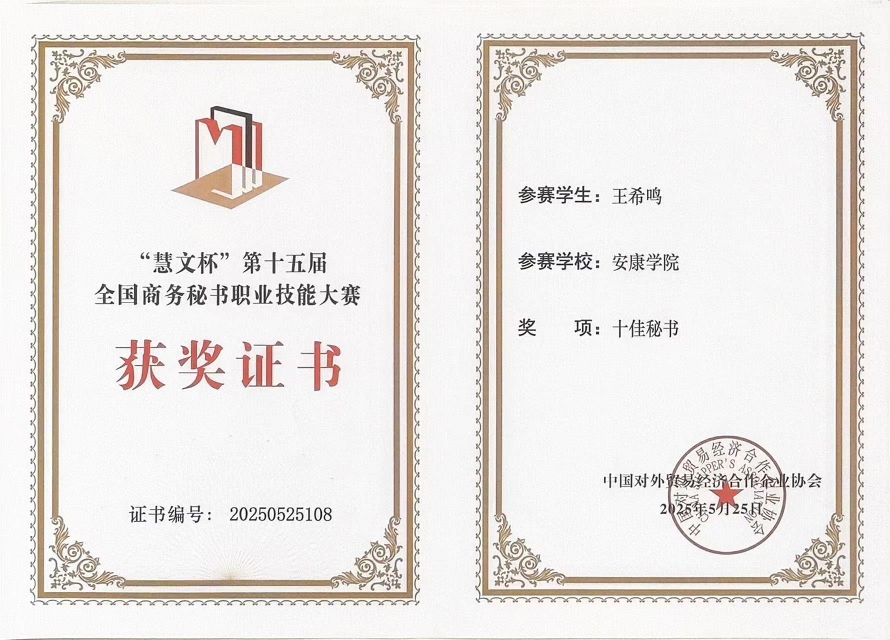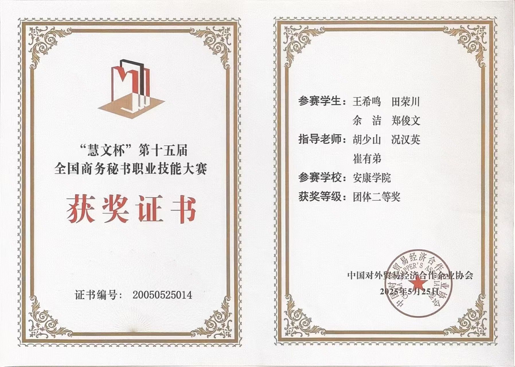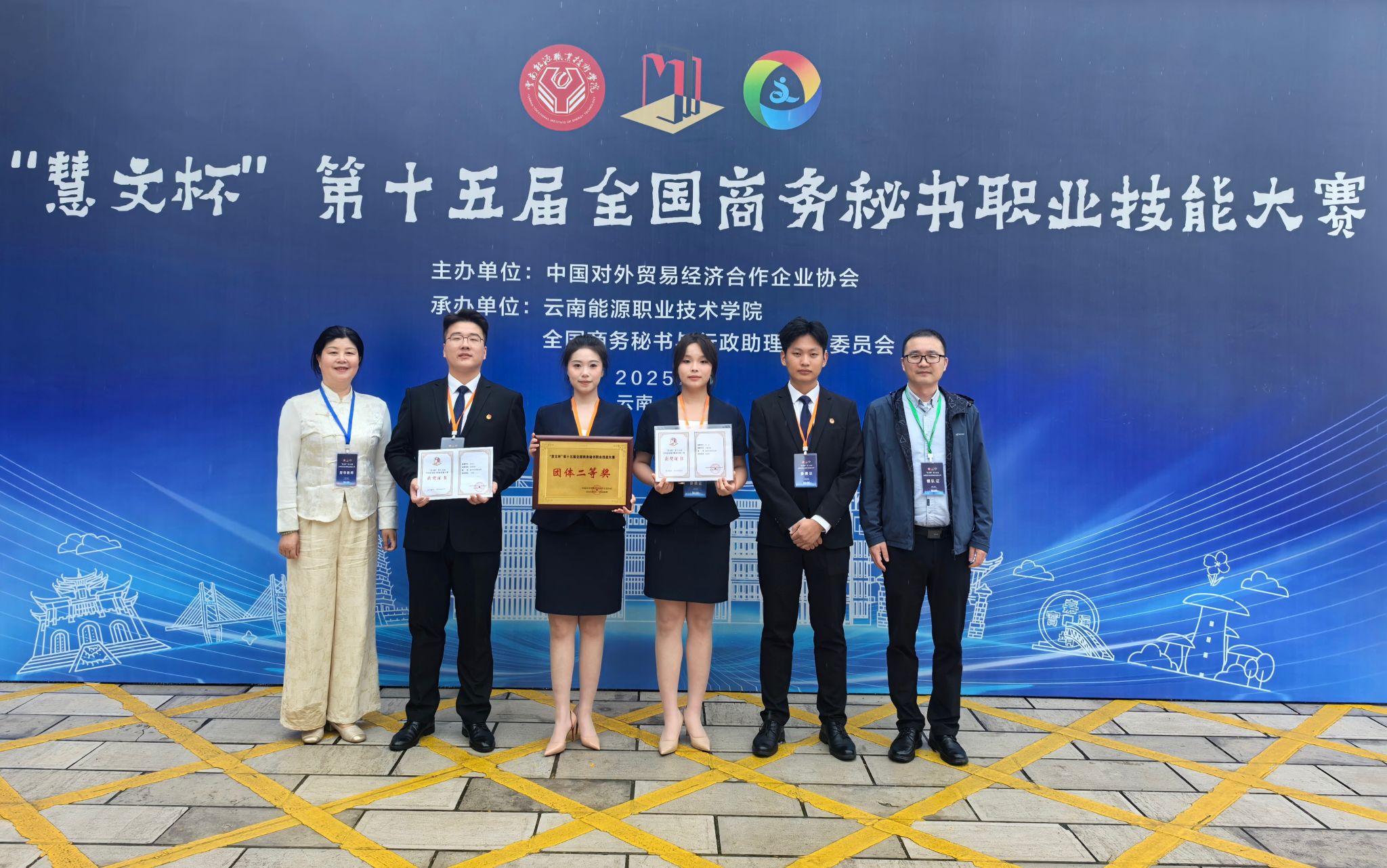 5月25日,由中国对外贸易经济合作企业协会主办的“慧文杯”第十五届全国商务秘书职业技能大赛在曲靖云南能源职业技术学院举办,来自全国66所本专科院校的94支代表队同台竞技,共展秘书学子风采。我校koko体育官网秘书学专业学生王希鸣、余洁、田荣川、郑竣文,在指导教师胡少山、况汉英的指导和带领下组队参赛,喜获“慧文杯”第十五届全国商务秘书职业技能大赛团体二等奖,王希鸣荣获“十佳秘书”称号,余洁获秘书专项事务处理特等奖、田荣川获秘书专项事务处理一等奖。