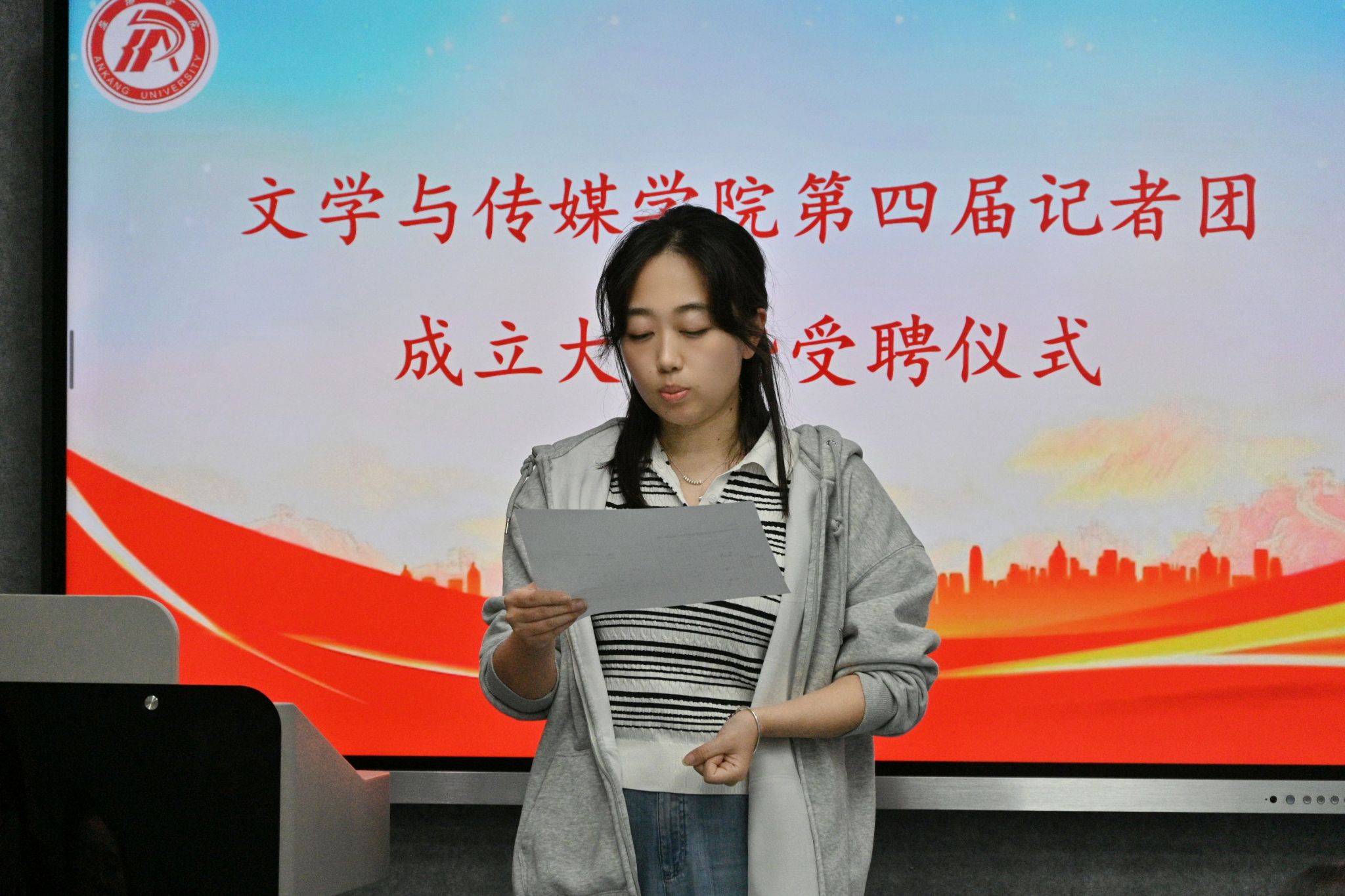 活动伊始,第三届记者团副主编程乐总结过往经验并予以卸任留言,呼吁新成员继承优良传统,以“脚力、眼力、脑力、笔力”服务学院发展,以“求真、求实、求新”的态度雕琢作品,探索校园宣传新路径,在各类挑战中不断成长。