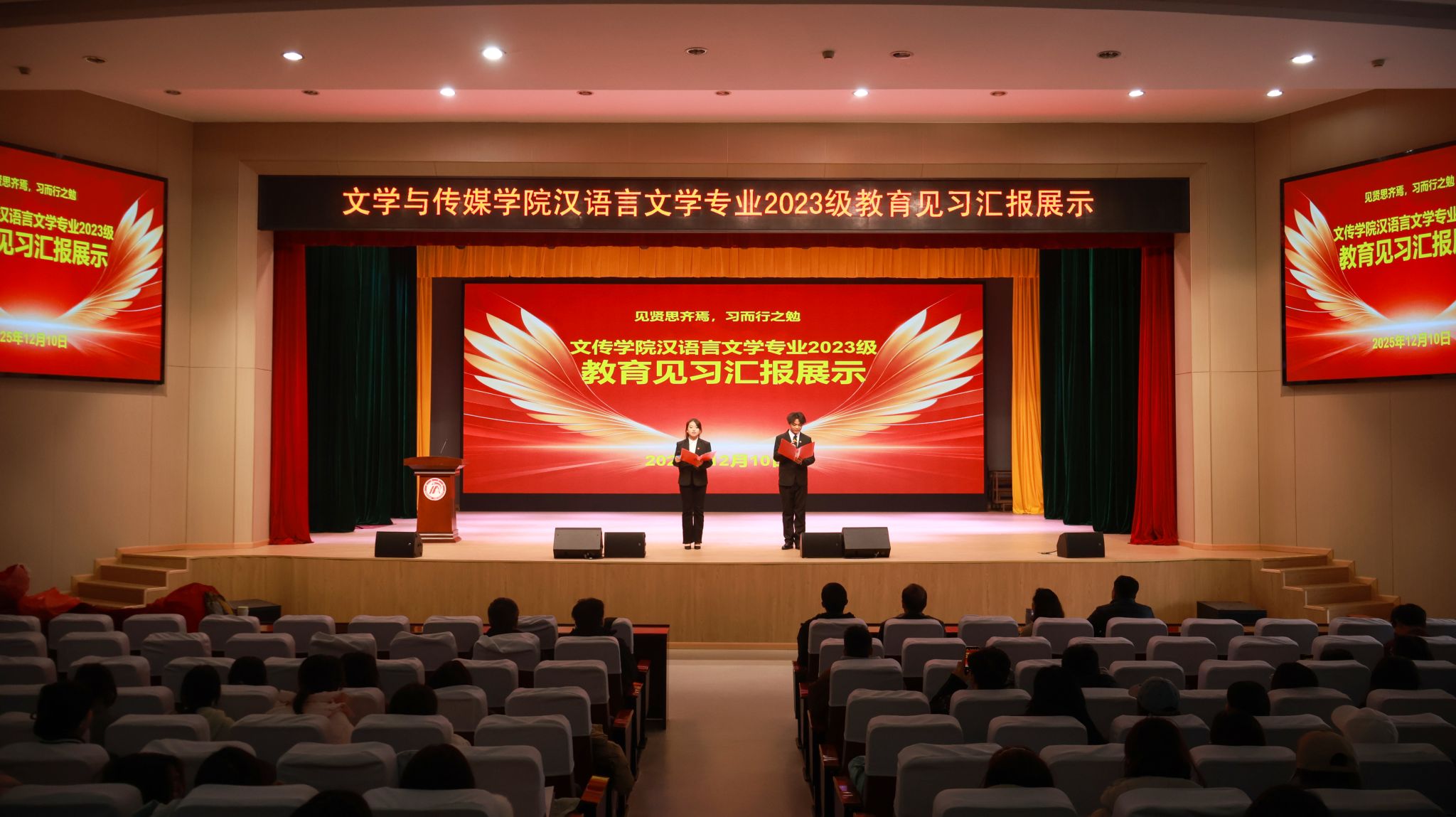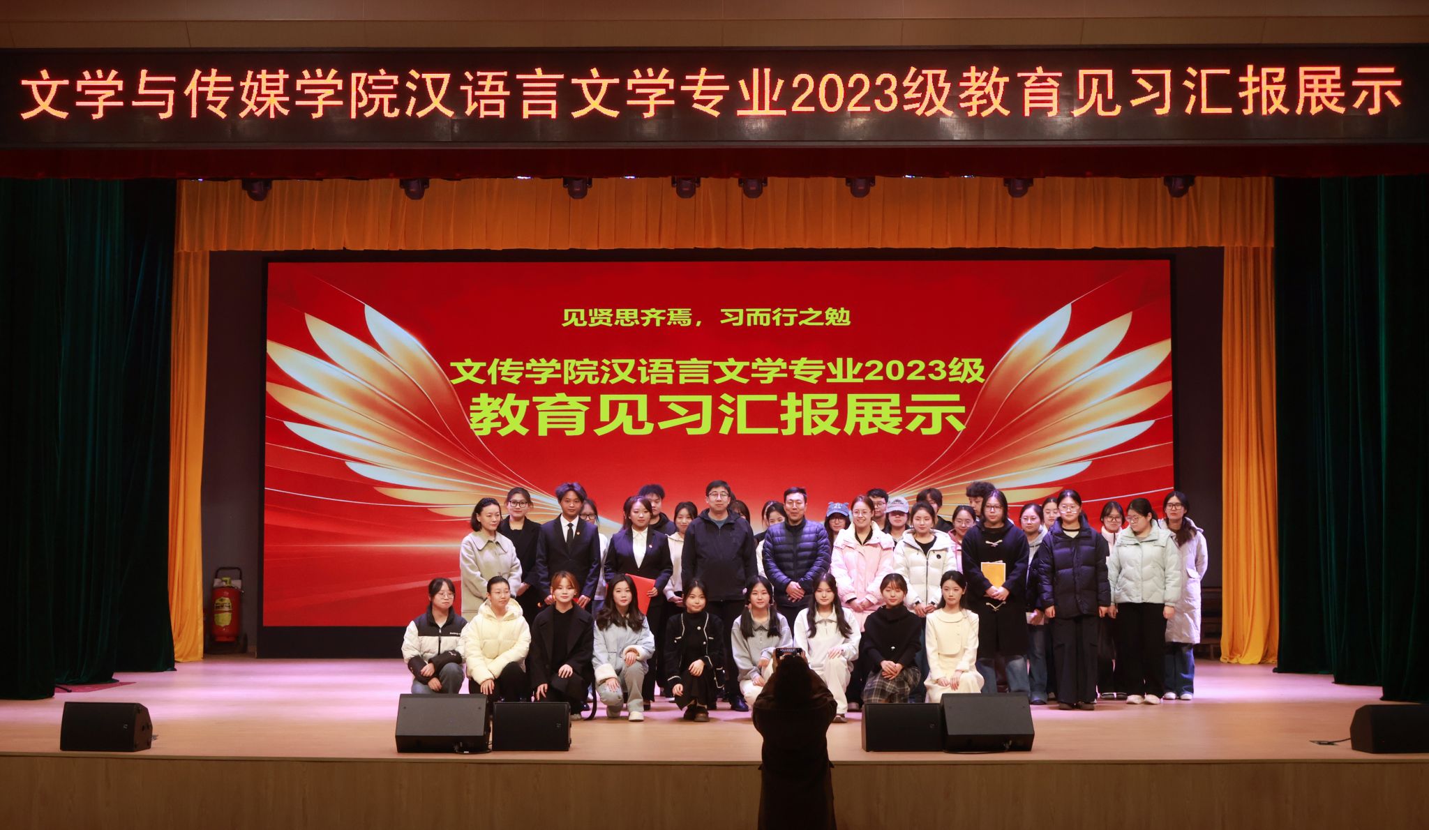 12月4日下午4点半,koko体育官网在江南校区大礼堂隆重举行汉语言文学专业2023级教育见习1汇报展示活动。本次活动旨在全面检验与展示2023级学生的教育见习成果,搭建交流互鉴平台,深化师范生对中学语文教育教学的理论认知与实践体悟。学院领导、两办主任等出席活动。本次活动由学科教学论任课教师张格瑄策划指导,汉语言文学专业2023级全体学生参加。