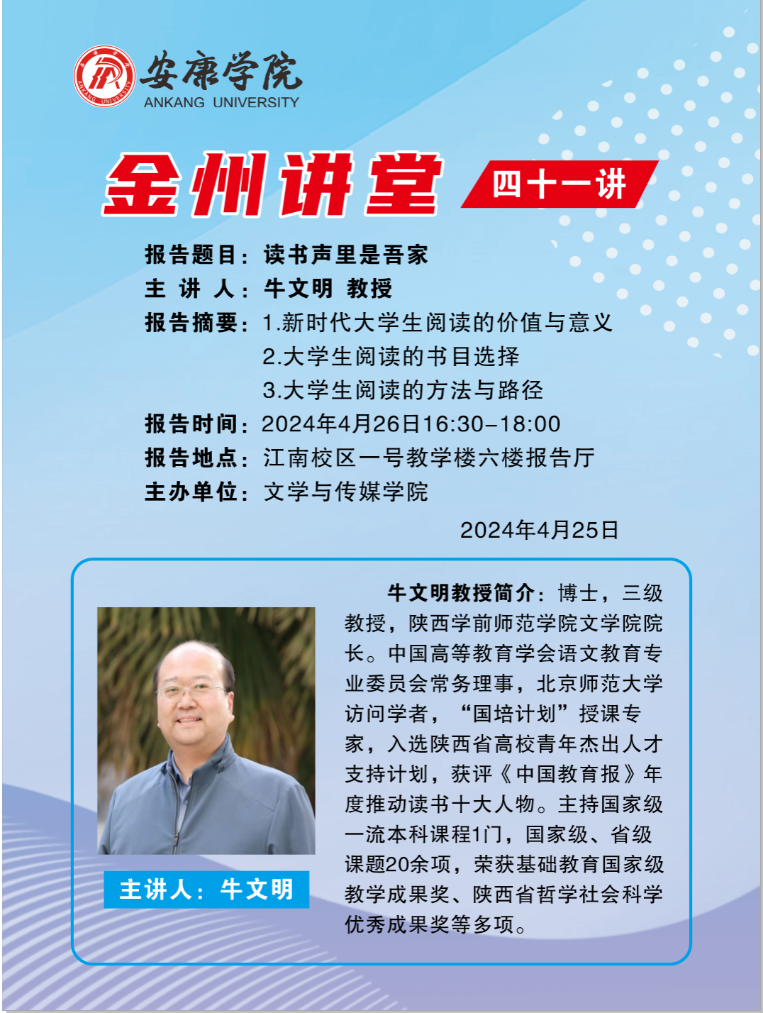 导航痕迹 首页 > 新闻通知 > 通知公告 > 正文 学院新闻 通知公告 金州讲堂四十一讲 主讲人:牛文明(陕西学前师范学院文学院院长) 发布人:koko体育官网 发布日期:2024年04月24日 阅读次数: