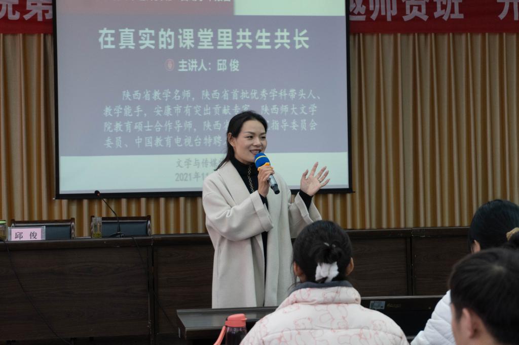 11月24日下午,陕西教学名师邱俊受邀为第一届“中学语文卓越师资班”作首场学术报告,题目是《在真实的课堂里共生共长》。学术报告由“中学语文卓越师资班”班主任张格瑄主持,94名卓越师资班学生认真聆听了学术报告。