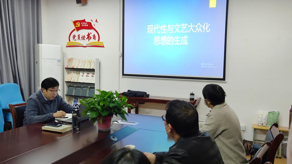 曹刚博士围绕主题从四个方面进行了学术汇报:第一,从现代性的词源追溯、现代性时间的文化观念起源、现代性时间的人类生存论基础、现代性时间的科学基础等方面梳理了现代性时间的生成历史;第二,从进化论与中国现代时间的起源,分析了进化论与中国追求现代民族国家的历史目标之间的统一;第三,从与进步主义历史哲学观、中国传统大同思想、新政治主体文化塑造、审美共通体建立之间的关系分析了文艺大众化思想的生存;最后,曹刚指出现代性并不是一种价值标准,而是一种反思的框架,百年中国现代化发展过程中的众多社会目标都可以在这一框架内得到更为有穿透力的解释。主报告后,到场师生针对报告内容,从不同立场进行了讨论和交流。