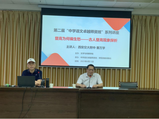 2023年6月13日下午七点,koko体育官网邀请西安交大附中副校长、省级学科带头人和教学能手秦万学为koko官网第二届“中学语文卓越师资班”师生做了题为“登高为何偏生愁——古人登高现象的探析”的精彩讲座。讲座由koko体育官网副院长朱云主持,班主任张格瑄、语文学科教学论老师唐明珍和第二届“中学语文卓越师资班”的全体学生聆听了本场讲座。