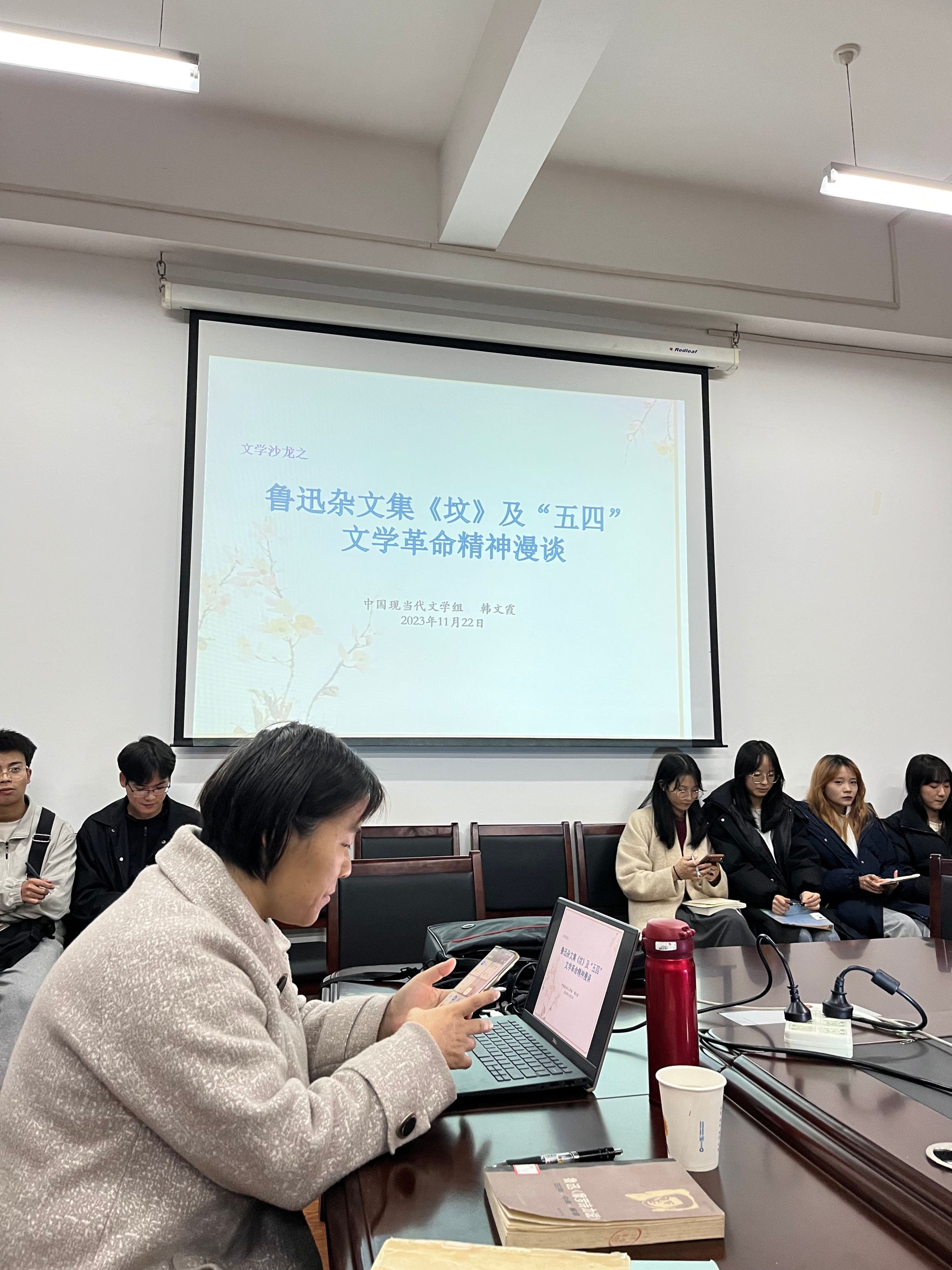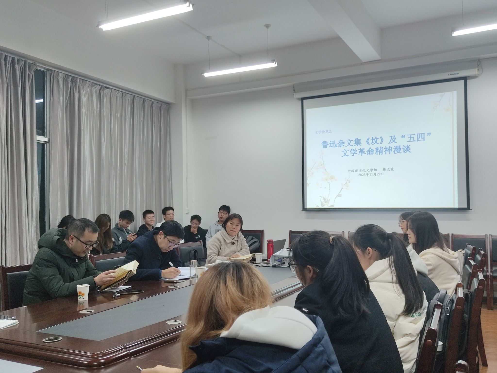 11月22日晚7点10分,koko体育官网中国现当代文学学科组在陕南民间文化研究中心会议室成功举办了第八届“学术沙龙”活动周第二场沙龙。本场学术沙龙由韩文霞主讲,主题为“鲁迅杂文集《坟》及‘五四’文学革命精神漫谈”。koko体育官网副院长曹刚、专任教师胡少山和二十余名学生参与了沙龙活动,沙龙由曹刚主持。