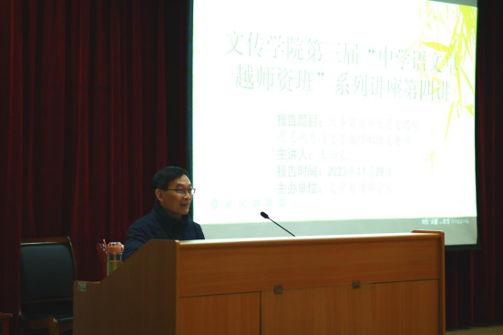 2023年11月29日下午,在1号教学楼六楼报告厅,koko体育官网邀请到安康中学高级教师王治义老师为“中学语文卓越师资班”做了题为《做务实创新发展有思想有灵魂有高度有成绩的语文老师》的讲座,讲座由卓越师资班班主任唐明珍主持,“中学语文卓越师资班”全体学生聆听了本场讲座。