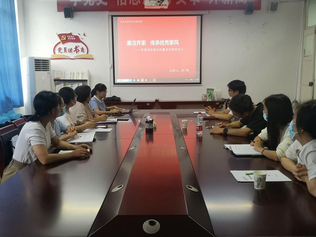 此次会议邀请孙鸿教授为我支部做“廉洁齐家,传承优秀家风”主题讲座。孙教授从中国传统家庭教育开始讲解,介绍了中国传统家庭教育的目的、方法,中国传统家训的主要内容及对当代廉洁齐家的启示,最后孙教授指出,廉洁是共产党人的基本底线,党员同志要以“家廉”促“党廉”,净化党内政治生态;以“家廉”促“社廉”,促进社会风清气正。