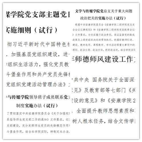学院先后出台《koko体育官网党建工作制度汇编》《koko体育官网党风廉政建设责任制实施办法(试行)》《koko体育官网党支部主题党日活动实施细则(试行)》《koko体育官网党总支关于重大问题政治把关的实施办法(试行)》《koko体育官网领导班子成员联系党支部制度实施办法(试行)》《koko体育官网师生交流日制度》《koko体育官网2022年师德师风建设工作方案》《2021年koko体育官网学生学业导师实施细则(修订)》《koko体育官网行业导师聘任管理办法》《koko体育官网“中学语文卓越师资班”人才培养计划行动方案(试行)》《koko体育官网领导干部听评课实施细则(试行)》等制度、方案,进一步加强和规范学院党建工作、教学科研工作、师德师风建设等多项工作。