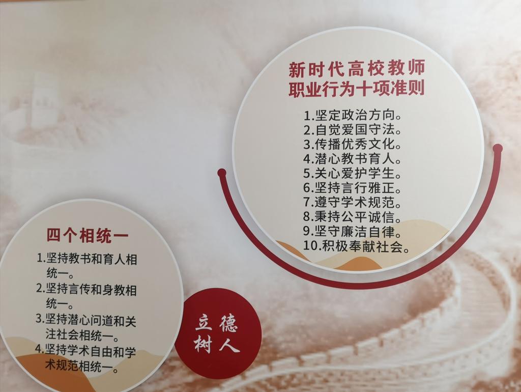 学院党总支强化政治理论学习体系建设,持续推进“理论学习中心组—党支部—教职工—各班团支部”四个层面的政治理论学习,武装全院师生头脑。严格按照年度政治理论学习计划,定期召开中心组学习会议、党支部学习会议、全体教职工政治理论学习会议,校领导、学院领导多次讲专题党课和思政课,带领学院师生认真学习贯彻习近平新时代中国特色社会主义思想和党的十九大精神,及时跟进学习党的十九届五中、六中全会精神和习近平总书记系列重要讲话精神,引导师生增强“四个意识”,坚定“四个自信”,做到“两个维护”,通过建设党建文化墙等宣传教师职业行为“十项准则”,引导全体教师涵养师德、见贤思齐,切实担负“为党育人,为国育才”的光荣使命,做好凝心铸魂、立德树人本职工作。