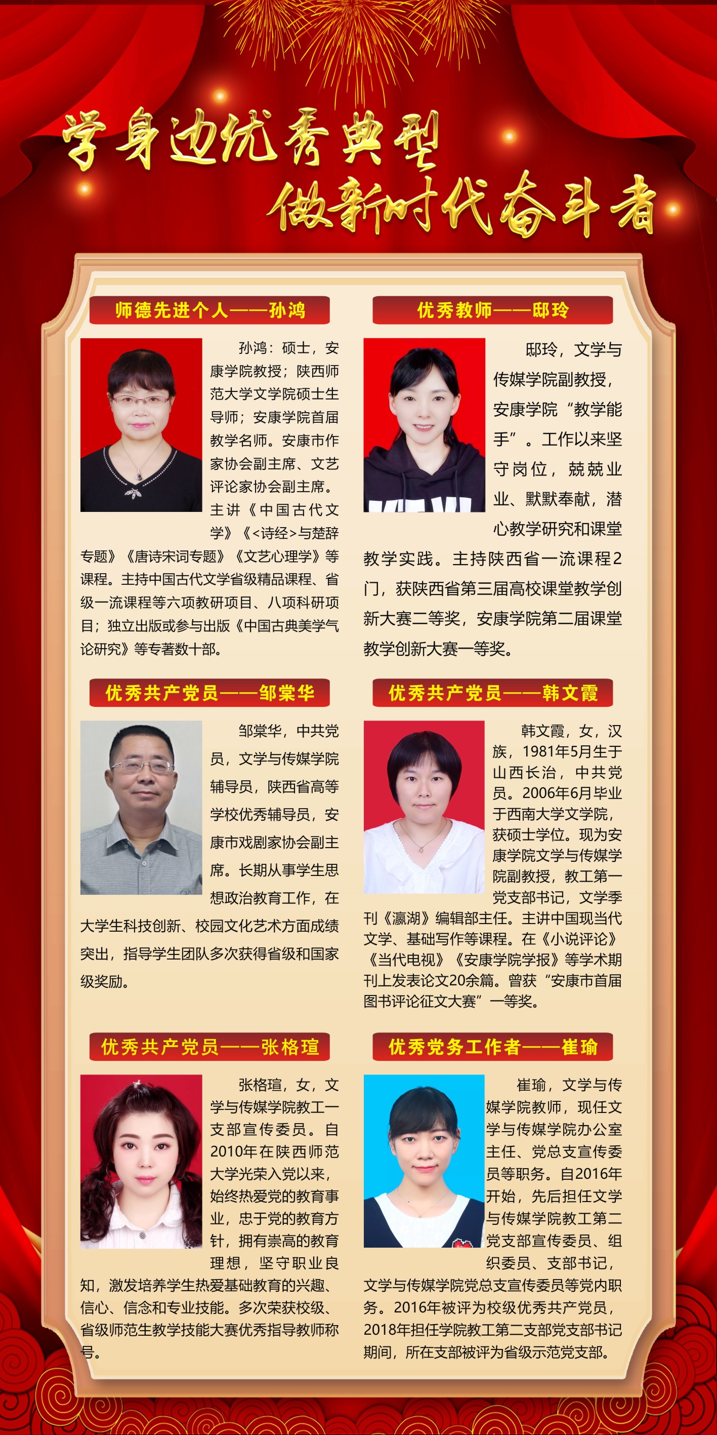 学院党总支成员充分发挥“头雁”效应,1人获得陕西省教学名师称号;1人参加陕西省高校年轻干部“励志·筑梦”专题培训班,被评为“优秀学员”;1人当选安康市文艺评论家协会主席;3人在学校及陕西省课堂创新大赛中取得优异成绩。同时,学院教工党支部书记均由系主任担任,充分发挥“双带头人”作用,引领支部党员教师开展政治理论学习及业务研讨等相关活动;学生党支部书记分别由学院学工办主任及团总支书记担任,深入了解学生思想动态,及时传递相关政策及文件精神等。在2021年校党委“两优一先”表彰大会上,学院荣获师德先进个人荣誉1人、优秀教师荣誉1人、优秀共产党员荣誉3人、优秀党务工作者荣誉1人。