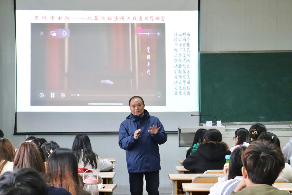 讲座从电视剧《觉醒年代》中辜鸿铭的演讲片段引入,启发学生思考如何构筑理想课堂与追寻有效教学,使学生认识到“理想课堂”需要目标明确、精心构思、埋下伏笔对话交流等要素。随后,李玉恒重点围绕文本解读的内涵、切口、策略及不同类型文本解读实操技巧等方面展开内容讲述。生动的案例、富于启发的引导使学生在聆听和互动中明白了语文阅读教学的重要性以及如何正确深入地解读文本的具体方法。